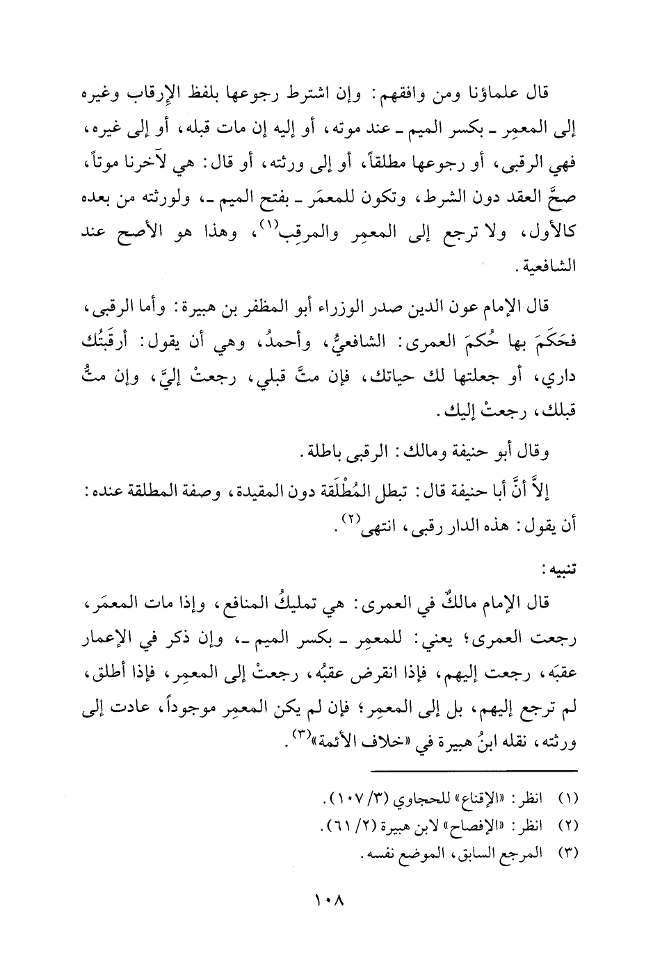 قال: الإمام مالكٌ في العمرى: هي تمليكُ المنافع، وإذا مات المعمَر، رجعت العمرى؛ يعني: للمعمِر -بكسر الميم-، وإن ذكر في الإعمار عقبَه، رجعت إليهم، فإذا انقرض عقبُه، رجعتْ إلى المعمِر، فإذا أطلق، لم ترجع إليهم، بل إلى المعمِر، فإن لم يكن المعمِر موجودًا، عادت إلى ورثته، نقله ابنُ هبيرة في "خلاف الأئمة" (٣).