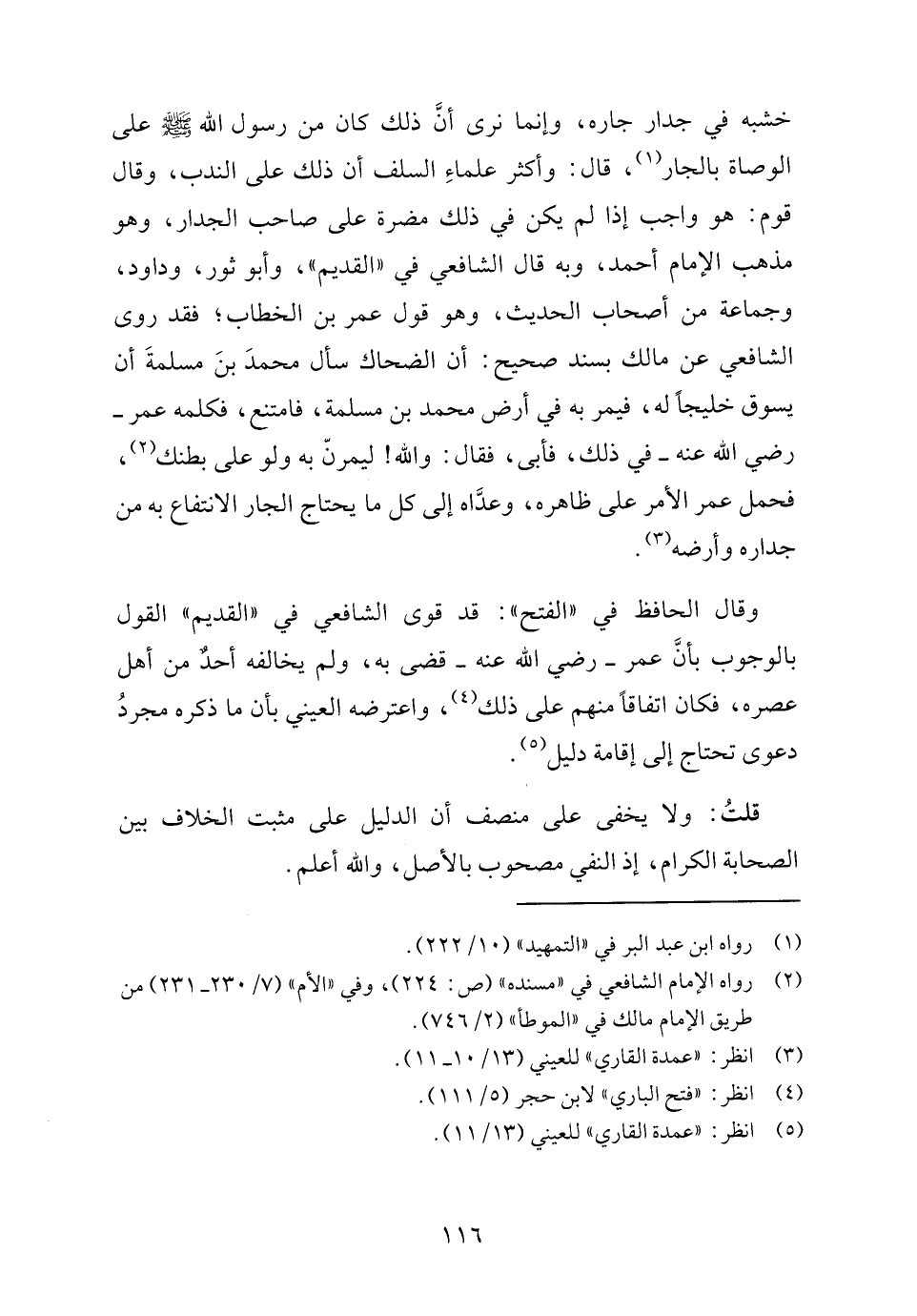 الشافعي عن مالك بسند صحيح: أن الضحاك سأل محمدَ بنَ مسلمةَ أن يسوق خليجًا له، فيمر به في أرض محمّد بن مسلمة، فامتنع، فكلمه عمر - رضي الله عنه - في ذلك، فأبى، فقال: والله! ليمرنّ به ولو على بطنك (٢)، فحمل عمر الأمر على ظاهره، وعدَّاه إلى كل ما يحتاج الجار الانتفاع به من جداره وأرضه (٣).
