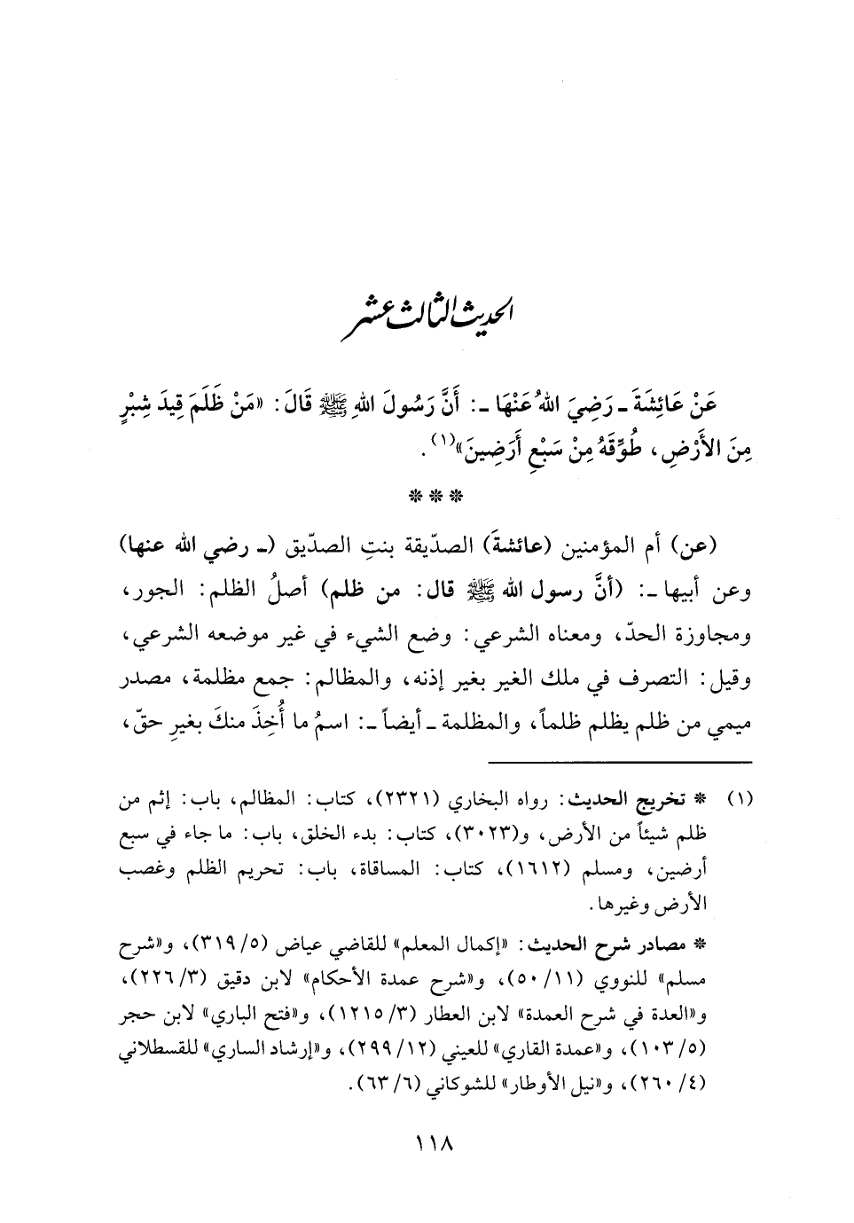 عَنْ عَائِشَةَ - رَضِيَ اللهُ عَنْهَا -: أَنَّ رَسُولَ اللهِ - صلى الله عليه وسلم - قَالَ: "مَنْ ظَلَمَ قِيدَ شِبْرٍ مِنَ الأَرْضِ، طُوَّقَهُ مِنْ سَبْعِ أَرَضِينَ" (١).