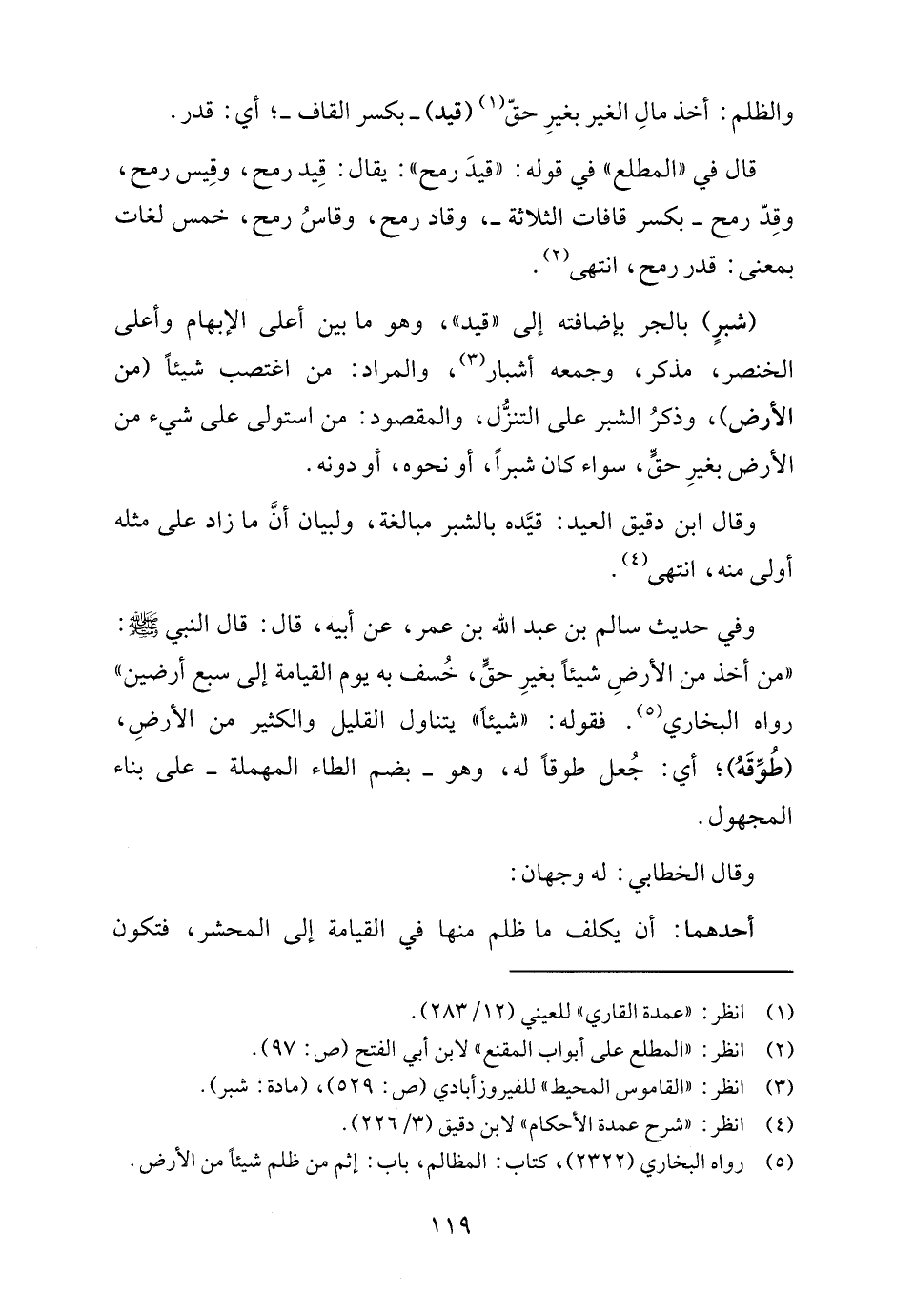 وفي حديث سالم بن عبد الله بن عمر، عن أبيه، قال: قال: النبي - صلى الله عليه وسلم -: "من أخذ من الأرضِ شيئًا بغيرِ حقٍّ، خُسف به يوم القيامة إلى سبع أرضين" رواه البخاري (٥). فقوله: "شيئًا" يتناول القليل والكثير من الأرضِ، (طُوِّقَهُ)؛ أي: جُعل طوقًا له، وهو -بضم الطاء المهملة- على بناء المجهول.