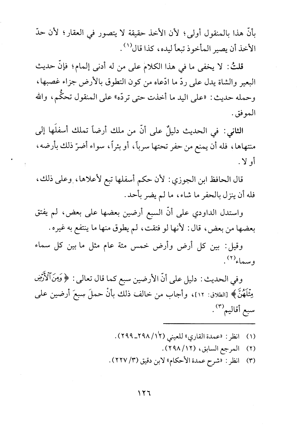وفي الحديث: دليل على أنّ الأرضين سبع كما قال تعالى: {وَمِنَ الْأَرْضِ مِثْلَهُنَّ} [الطلاق: ١٢]، وأجاب من خالف ذلك بأنْ حملَ سبعَ أرضين على سبع أقاليم (٣).