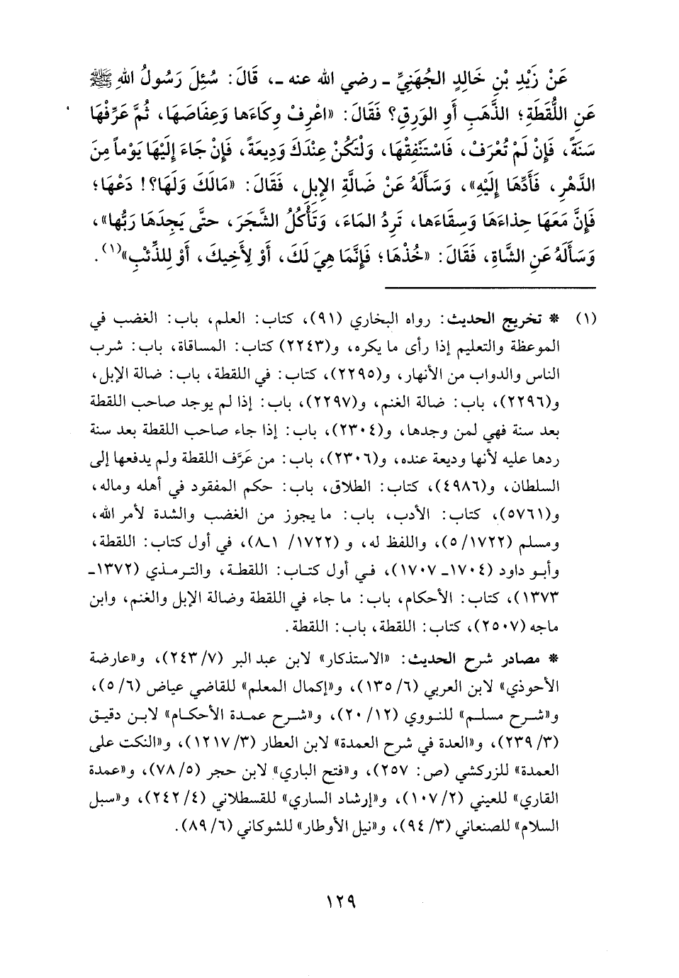 عَنْ زَيْدِ بْنِ خَالِدٍ الجُهَنِيِّ - رضي الله عنه -، قَالَ: سُئِلَ رَسُولُ اللهِ - صلى الله عليه وسلم - عَنِ اللُّقَطَةِ، الذَّهَبِ أَوِ الوَرِقِ؟ فَقَالَ: "اعْرِفْ وِكَاءَها وَعِفَاصَهَا، ثُمَّ عَرِّفْهَا سَنةً، فَإِنْ لَمْ تُعْرَفْ، فَاسْتَنْفِقْهَا، وَلْتكُنْ عِنْدَكَ وَدِيعَةً، فَإنْ جَاءَ إِلَيْهَا يَوْمًا مِنَ الدَّهْرِ، فَأَدِّهَا إِلَيْهِ"، وَسَأَلَهُ عَنْ ضَالَّةِ الإِبِل، فَقَالَ: "مَالَكَ وَلَهَا؟! دَعْهَا، فَإِنَّ مَعَهَا حِذاءَهَا وَسِقَاءَها، تَرِدُ المَاءَ، وَتَأْكُلُ الشَّجَرَ، حتَّى يَجِدَهَا رَبُّها"، وَسَأَلَهُ عَنِ الشَّاةِ، فَقَالَ: "خُذْهَا، فَإِنَّمَا هِيَ لَكَ، أَوْ لِأَخِيكَ، أَوْ لِلذِّئْبِ" (١).
