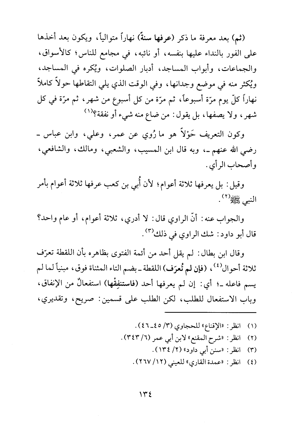 (ثم) بعد معرفة ما ذكر (عرفها سنةً) نهارًا متواليًا، ويكون بعد أخذها على الفور بالنداء عليها بنفسه، أو نائبه، في مجامع للناس، كالأسواق، والجماعات، وأبواب المساجد، أدبار الصلوات، ويُكره في المساجد، ويُكثر منه في موضع وجدانها، وفي الوقت الذي يلي التقاطها حولًا كاملًا نهارًا كلّ يوم مرّة أسبوعًا، ثمّ مرّة من كل أسبوع من شهر، ثم مرّة في كل شهر، ولا يصفها، بل يقول: من ضاع منه شيء أو نفقة؟ (١)