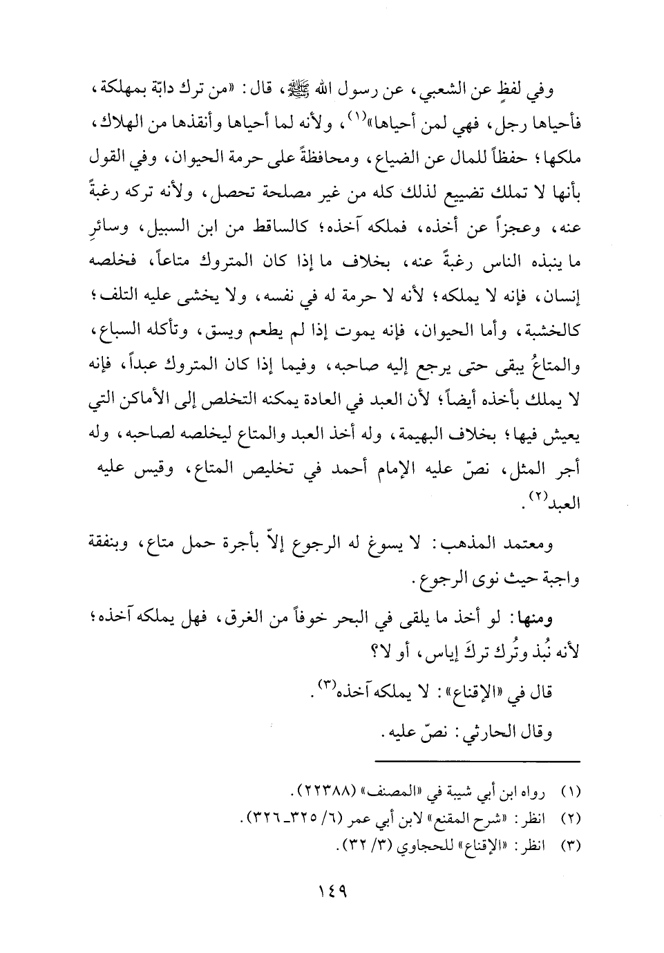 وفي لفظٍ عن الشعبي، عن رسول الله - صلى الله عليه وسلم -، قال: "من ترك دابّة بمهلكة، فأحياها رجل، فهي لمن أحياها" (١)، ولأنه لما أحياها وأنقذها من الهلاك، ملكها، حفظًا للمال عن الضياع، ومحافظةً على حرمة الحيوان، وفي القول بأنها لا تملك تضييع لذلك كله من غير مصلحة تحصل، ولأنه تركه رغبةً عنه، وعجزًا عن أخذه، فملكه آخذه، كالساقط من ابن السبيل، وسائرِ ما ينبذه الناس رغبةً عنه، بخلاف ما إذا كان المتروك متاعًا، فخلصه إنسان، فإنه لا يملكه؛ لأنه لا حرمة له في نفسه، ولا يخشى عليه التلف، كالخشبة، وأما الحيوان، فإنه يموت إذا لم يطعم ويسق، وتأكله السباع، والمتاعُ يبقى حتى يرجع إليه صاحبه، وفيما إذا كان المتروك عبدًا، فإنه لا يملك بأخذه أيضًا؛ لأن العبد في العادة يمكنه التخلص إلى الأماكن التي يعيش فيها، بخلاف البهيمة، وله أخذ العبد والمتاع ليخلصه لصاحبه، وله أجر المثل، نصّ عليه الإمام أحمد في تخليص المتاع، وقيس عليه العبد (٢).