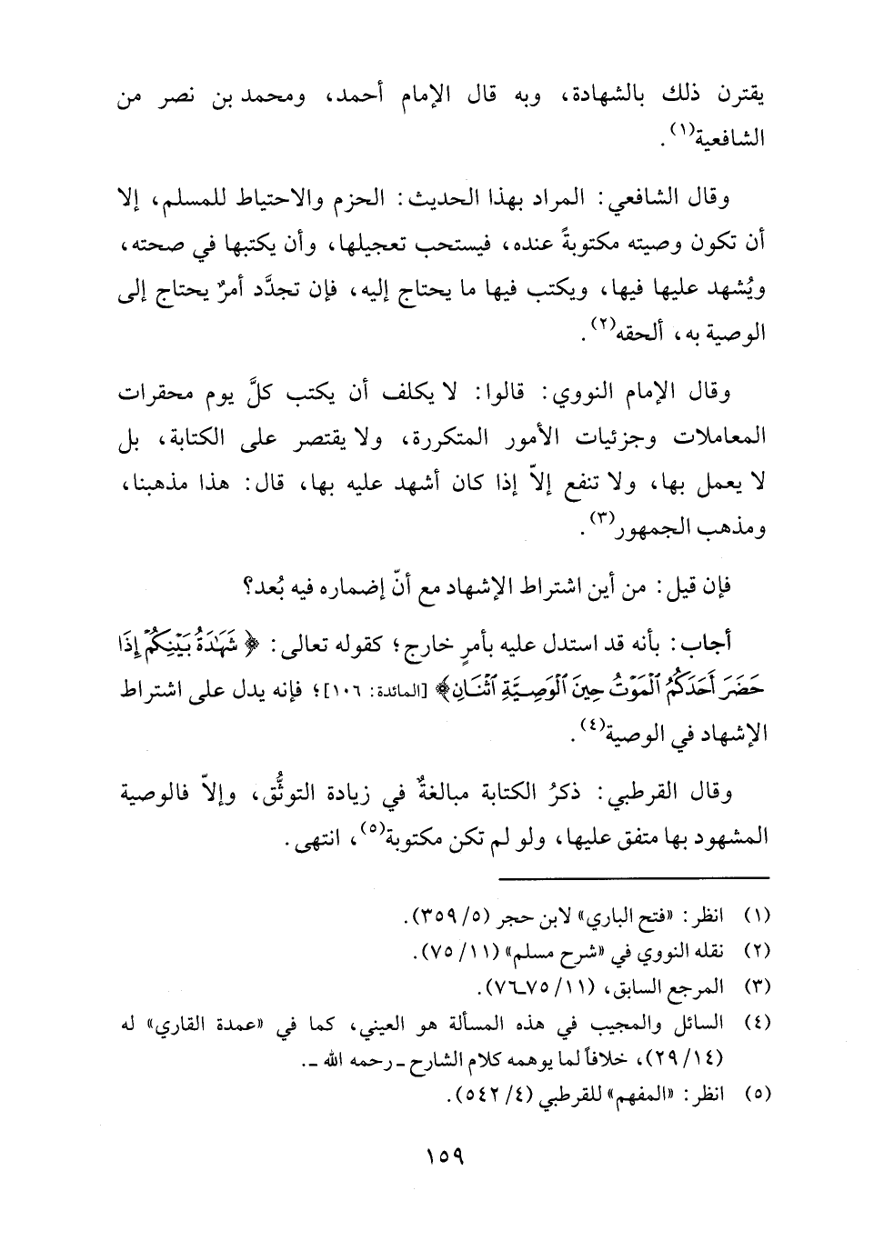 وقال الشافعي: المراد بهذا الحديث: الحزم والاحتياط للمسلم، إلا أن تكون وصيته مكتوبةً عنده، فيستحب تعجيلها، وأن يكتبها في صحته، ويُشهد عليها فيها، ويكتب فيها ما يحتاج إليه، فإن تجدَّد أمرٌ يحتاج إلى الوصية به، ألحقه (٢).