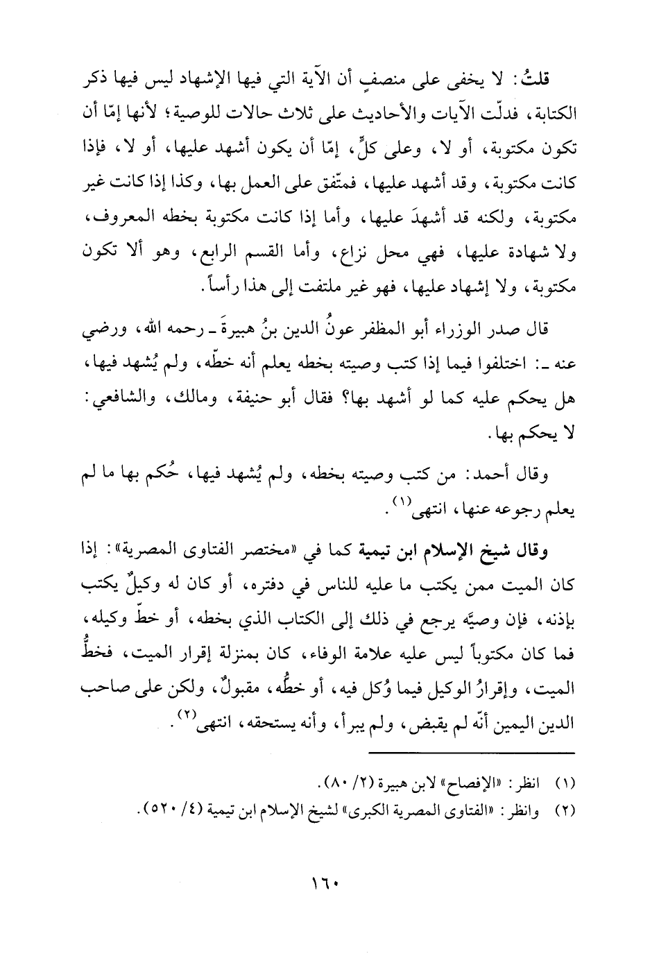 قال صدر الوزراء أبو المظفر عونُ الدين بنُ هبيرةَ -رحمه الله، ورضي عنه-: اختلفوا فيما إذا كتب وصيته بخطه يعلم أنه خطّه، ولم يُشهد فيها، هل يحكم عليه كما لو أشهد بها؛ فقال أبو حنيفة، ومالك، والشافعي: لا يحكم بها.