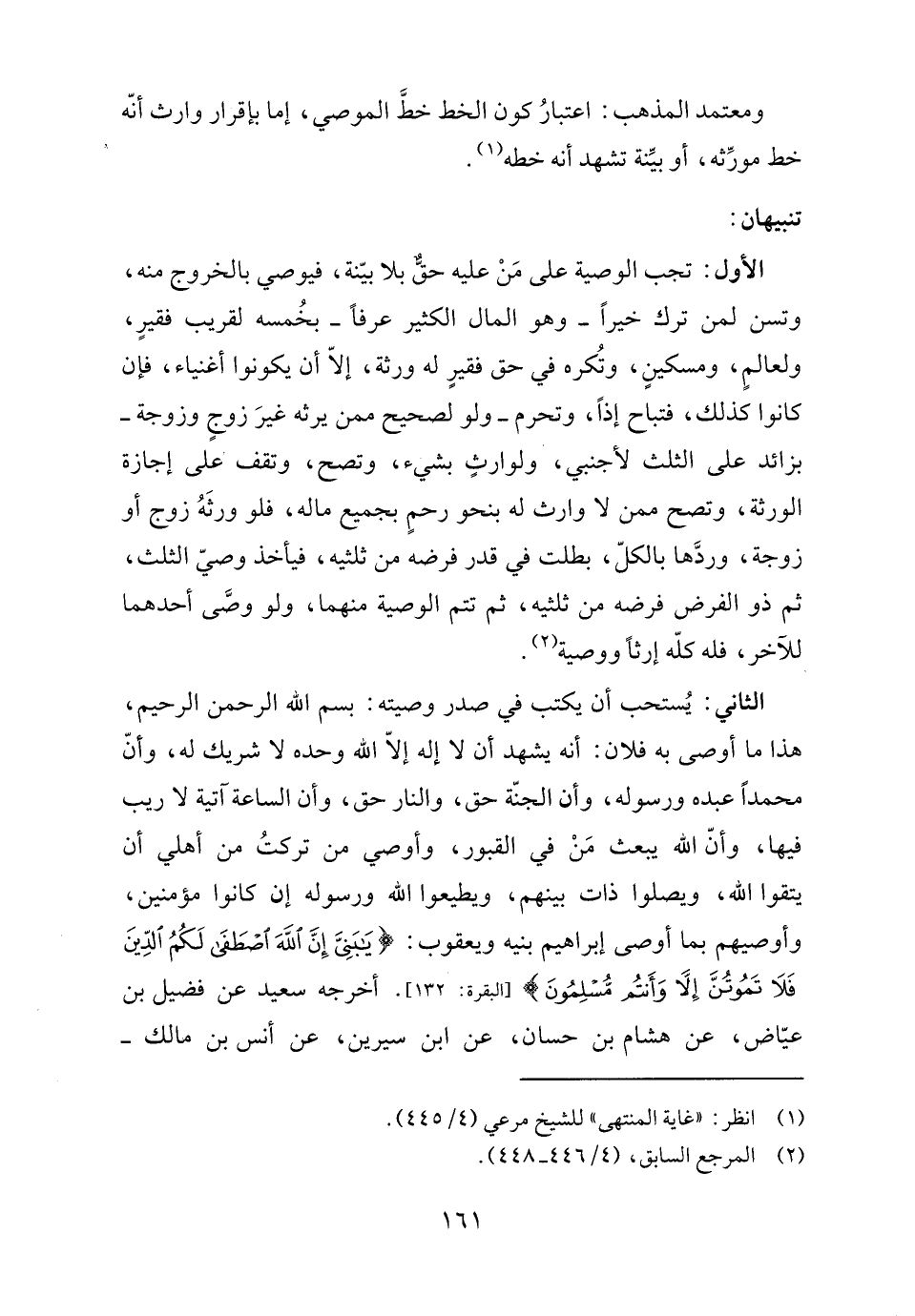 الأوّل: تجب الوصية على مَنْ عليه حقٌّ بلا بيّنة، فيوصي بالخروج منه، وتسن لمن ترك خيرًا -وهو المال الكثير عرفًا- بخُمسه لقريب فقيرٍ، ولعالمٍ، ومسكينٍ، وتُكره في حق فقيرٍ له ورثة، إلا أن يكونوا أغنياء، فإن كانوا كذلك، فتباح إِذًا، وتحرم -ولو لصحيح ممّن يرثه غيرَ زوجٍ وزوجة- بزائد على الثلث لأجنبي، ولوارثٍ بشيء، وتصح، وتقف على إجازة الورثة، وتصح ممّن لا وارث له بنحو رحمٍ بجميع ماله، فلو ورثَهُ زوج أو زوجة، وردَّها بالكلّ، بطلت في قدر فرضه من ثلثيه، فيأخذ وصيّ الثلث،