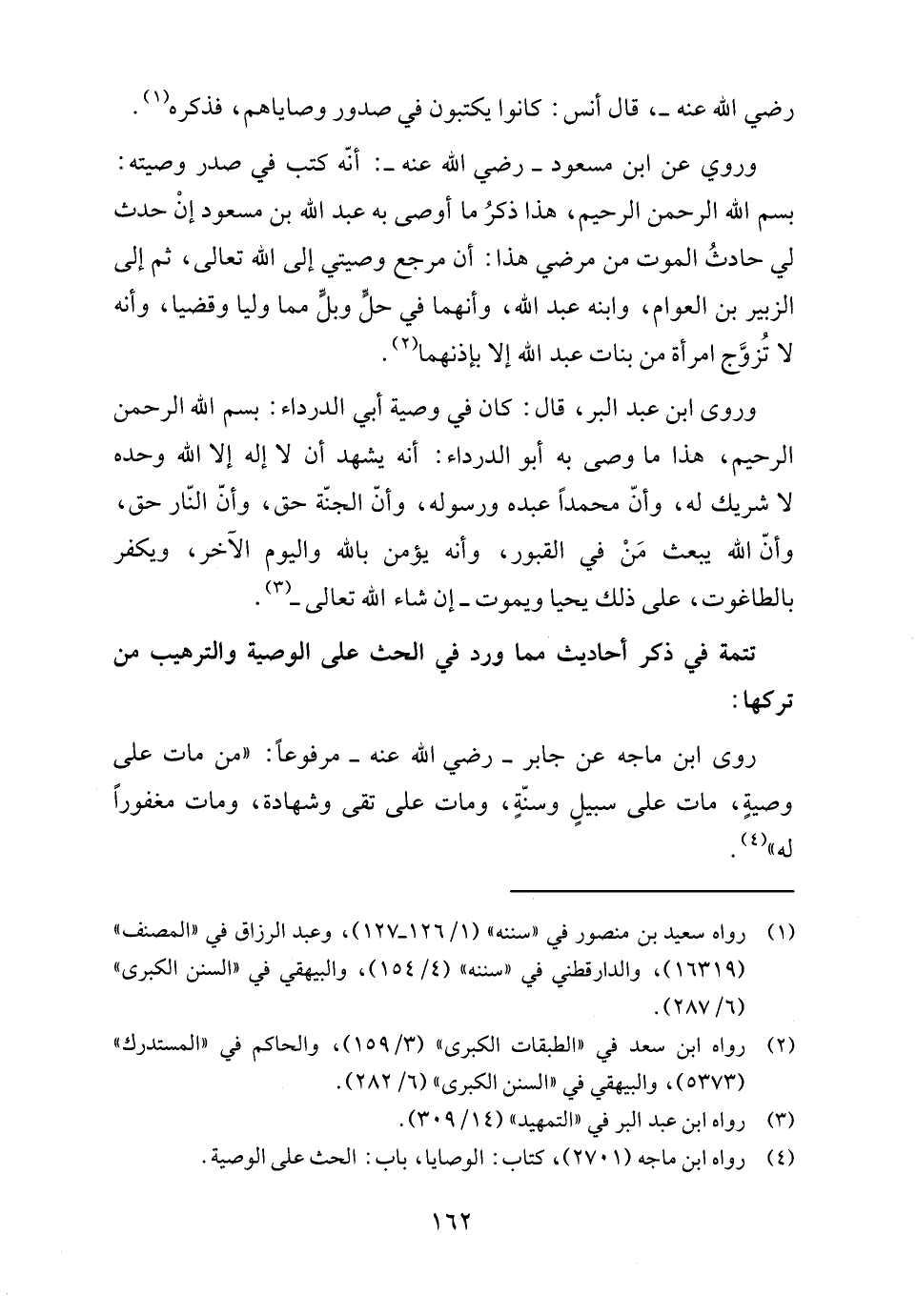 (٤) رواه ابن ماجة (٢٧٠١)، كتاب: الوصايا، باب: الحث على الوصية.