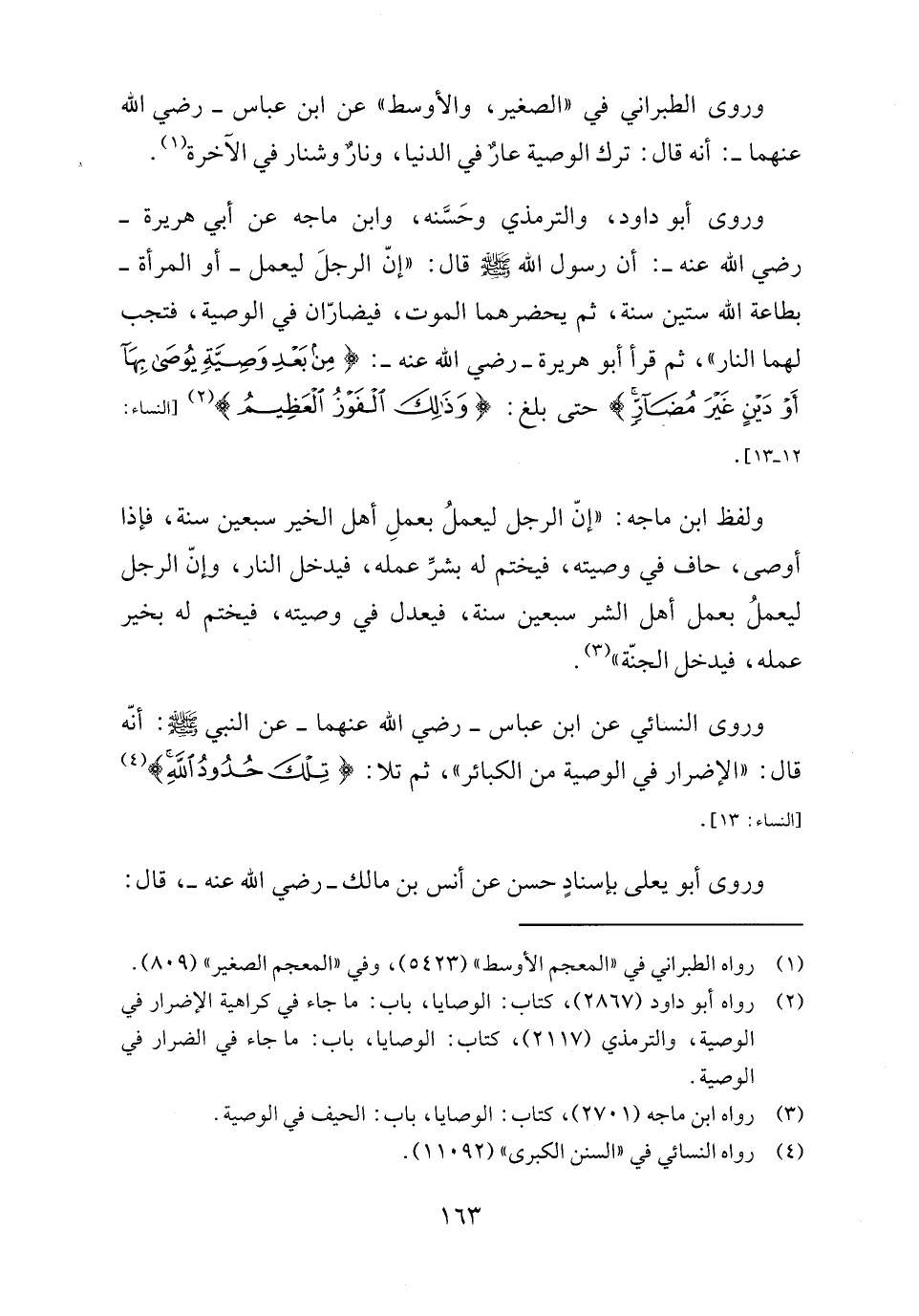 وروى النسائي عن ابن عباس - رضي الله عنهما - عن النبي - صلى الله عليه وسلم -: أنّه قال: "الإضرار في الوصية من الكبائر"، ثم تلا: {تِلْكَ حُدُودُ اللَّهِ} (٤) [النساء: ١٣].
