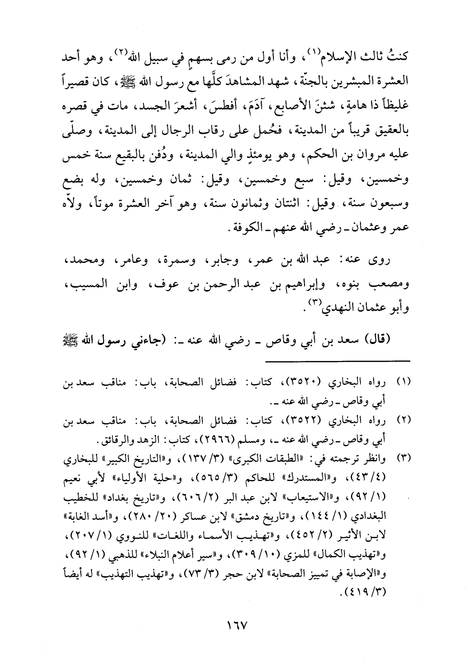 كنتُ ثالث الإسلام (١)، وأنا أول من رمى بسهمٍ في سبيل الله (٢)، وهو أحد العشرة المبشرين بالجنّة، شهد المشاهدَ كلَّها مع رسول الله - صلى الله عليه وسلم -، كان قصيرًا غليظًا ذا هامةٍ، شثنَ الأصابع، آدَمَ، أفطسَ، أشعرَ الجسد، مات في قصره بالعقيق قريبًا من المدينة، فحُمل على رقاب الرجال إلى المدينة، وصلّى عليه مروان بن الحكم، وهو يومئذٍ والي المدينة، ودُفن بالبقيع سنة خمس وخمسين، وقيل: سبع وخمسين، وقيل: ثمان وخمسين، وله بضع وسبعون سنة، وقيل: اثنتان وثمانون سنة، وهو آخر العشرة موتًا، ولّاه عمر وعثمان - رضي الله عنهم - الكوفة.
