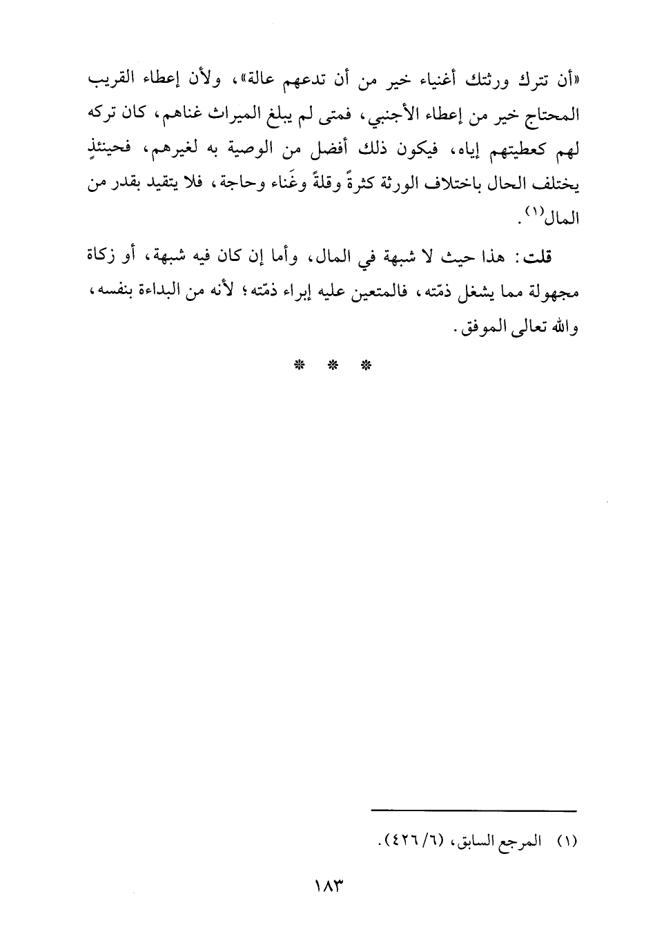 قلت: هذا حيث لا شبهة في المال، وأما إن كان فيه شبهة، أو زكاة مجهولة مما يشغل ذمّته، فالمتعين عليه إبراء ذمّته؛ لأنه من البداءة بنفسه، والله تعالى الموفق.