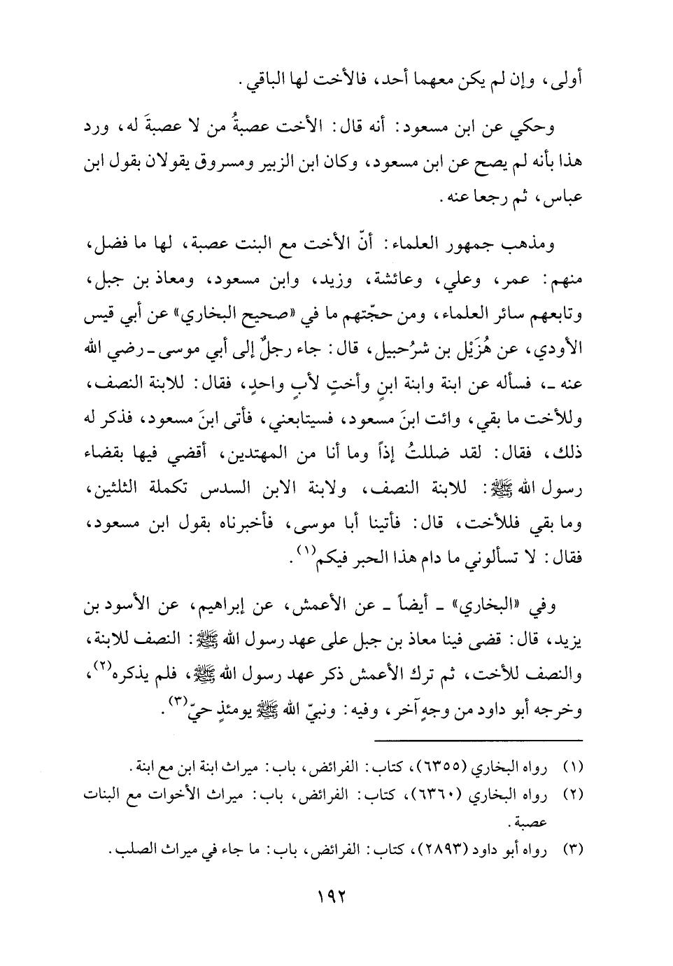ومذهب جمهور العلماء: أن الأخت مع البنت عصبة، لها ما فضل، منهم: عمر، وعلي، وعائشة، وزيد، وابن مسعود، ومعاذ بن جبل، وتابعهم سائر العلماء، ومن حجّتهم ما في "صحيح البخاري" عن أبي قيس الأودي، عن هُزَيْل بن شرُحبيل، قال: جاء رجلٌ إلى أبي موسى - رضي الله عنه -، فسأله عن ابنة وابنة ابنٍ وأختٍ لأبٍ واحدٍ، فقال: للابنة النصف، وللأخت ما بقي، فأئى ابنَ مسعود، فسيتابعني، فأتى ابنَ مسعود، فذكر له ذلك، فقال: لقد ضللتُ إِذًا وما أنا من المهتدين، أقضي فيها بقضاء رسول الله - صلى الله عليه وسلم -: للابنة النصف، ولابنة الابن السدس تكملة الثلثين، وما بقي فللأخت، قال: فأتينا أبا موسى، فأخبرناه بقول ابن مسعود، فقال: لا تسألوني ما دام هذا الحبر فيكم (١).