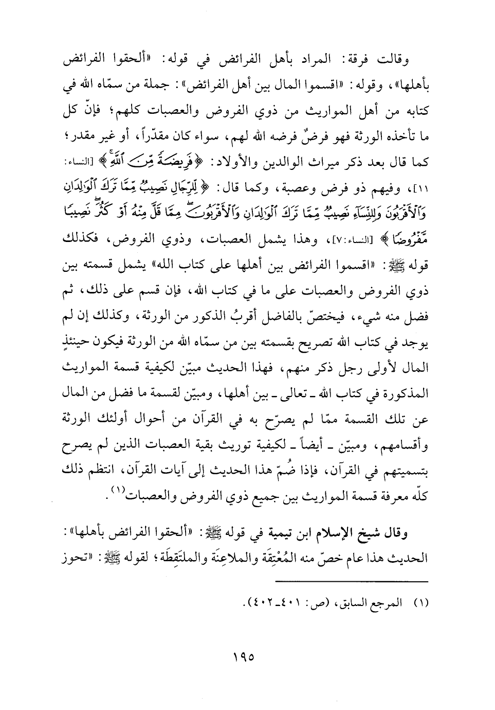 وقالت فرقة: المراد بأهل الفرائض في قوله: "ألحقوا الفرائض بأهلها"، وقوله: "اقسموا المال بين أهل الفرائض": جملة من سمّاه الله في كتابه من أهل المواريث من ذوي الفروض والعصبات كلهم، فإنّ كل ما تأخذه الورثة فهو فرضٌ فرضه الله لهم، سواء كان مقدّرًا، أو غير مقدر، كما قال بعد ذكر ميراث الوالدين والأولاد: {فَرِيضَةً مِنَ اللَّهِ} [النساء: ١١]، وفيهم ذو فرض وعصبة، وكما قال: {لِلرِّجَالِ نَصِيبٌ مِمَّا تَرَكَ الْوَالِدَانِ وَالْأَقْرَبُونَ وَلِلنِّسَاءِ نَصِيبٌ مِمَّا تَرَكَ الْوَالِدَانِ وَالْأَقْرَبُونَ مِمَّا قَلَّ مِنْهُ أَوْ كَثُرَ نَصِيبًا مَفْرُوضًا} [النساء: ٧]، وهذا يشمل العصبات، وذوي الفروض، فكذلك قوله - صلى الله عليه وسلم -: "اقسموا الفرائض بين أهلها على كتاب الله" يشمل قسمته بين ذوي الفروض والعصبات على ما في كتاب الله، فإن قسم على ذلك، ثم فضل منه شيء، فيختصّ بالفاضل أقربُ الذكور من الورثة، وكذلك إن لم يوجد في كتاب الله تصريح بقسمته بين من سمّاه الله من الورثة فيكون حينئذٍ المال لأولى رجل ذكر منهم، فهذا الحديث مبيّن لكيفية قسمة المواريث المذكورة في كتاب الله -تعالى- بين أهلها، ومبيّن لقسمة ما فضل من المال عن تلك القسمة ممّا لم يصرّح به في القرآن من أحوال أولئك الورثة وأقسامهم، ومبيّن -أيضًا- لكيفية توريث بقية العصبات الذين لم يصرح بتسميتهم في القرآن، فإذا ضُمّ هذا الحديث إلى آيات القرآن، انتظم ذلك كلّه معرفة قسمة المواريث بين جميع ذوي الفروض والعصبات (١).