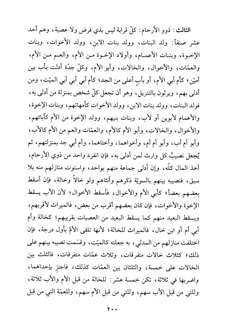الثالث: ذوو الأرحام: كلّ قرابة ليس بذي فرض ولا عصبة، وهم أحد عشر صنفًا: ولد البنات، وولد بنات الابن، وولد الأخوات، وبنات الإخوة، وبنات الأعمام، وأولاد الإخوة من الأم، والعم من الأم، والعمّات، والأخواله، والخالات، وأبو الأم، وكلّ جدّة أدلت بأب بين أميّن، كأم أبي الأم، أو بأبٍ أعلى من الجد، كأم أبي أبي أبي الميّت، ومن أدلى بهم، ويرثون بالتنزيل، وهو أن تجعل كلّ شخص بمنزلة من أدلى به، فولد البنات، وولد بنات الابن، وولد الأخوات كأمهاتهم، وبنات الإخوة، والأعمام لأبوين أو لأب، وبنات بنيهم، وولد الإخوة من الأم كآبائهم، والأخواله، والخالات، وأبو الأم كالأم، والعمّات والعم من الأم كالأب،