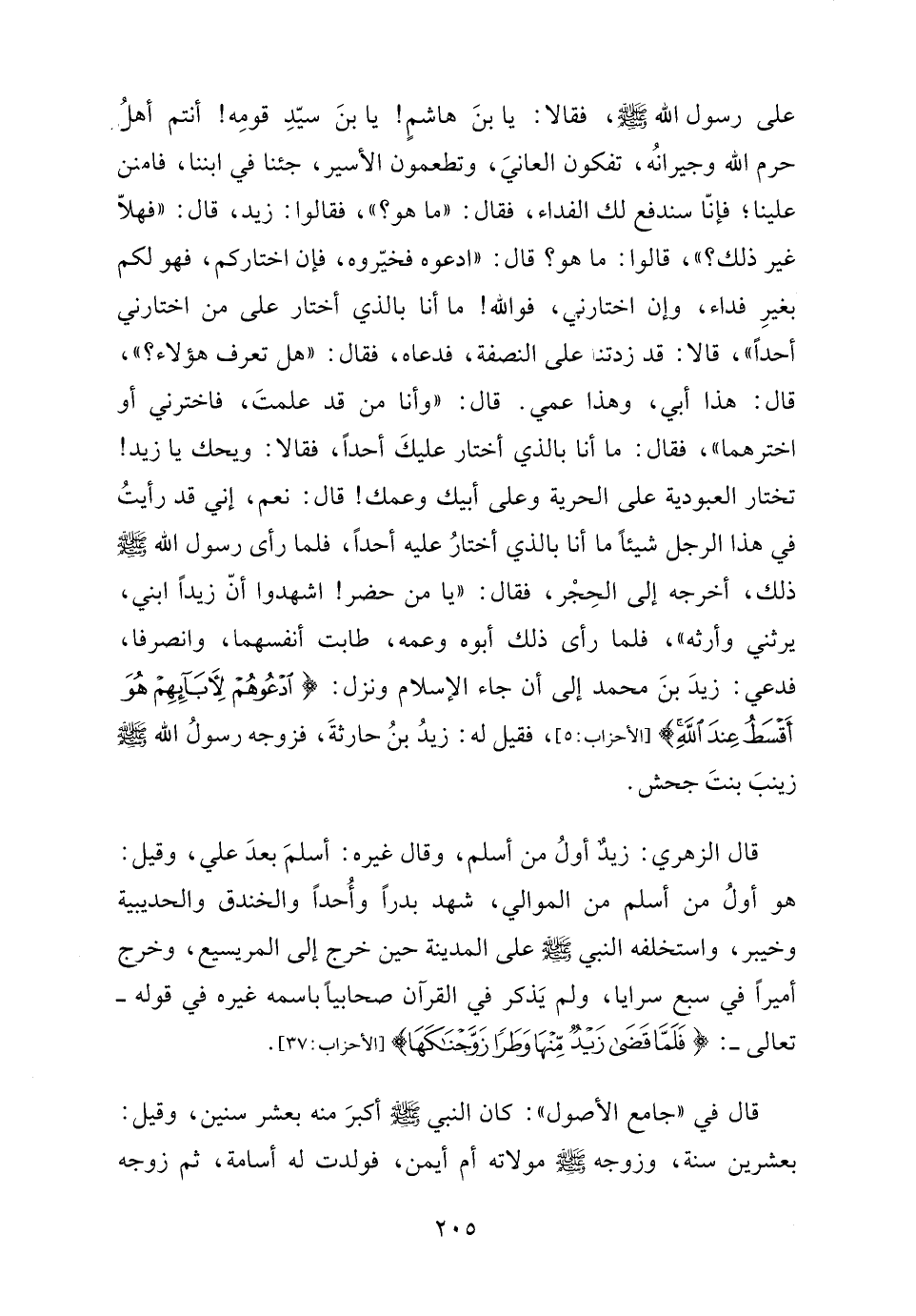 على رسول الله - صلى الله عليه وسلم -، فقالا: يا بنَ هاشمٍ! يا بنَ سيّدِ قومِه! أنتم أهلُ حرم الله وجيرانُه، تفكون العانيَ، وتطعمون الأسير، جئنا في ابننا، فامننن علينا، فإنّا سندفع لك الفداء، فقال: "ما هو؟ "، فقالوا: زيد، قال: "فهلّا غير ذلك؟ "، قالوا: ما هو؟ قال: "ادعوه فخيّروه، فإن اختاركم، فهو لكم بغيرِ فداء، وإن اختارني، فوالله! ما أنا بالذي أختار على من اختارني أحدًا"، قالا: قد زدتنا على النصفة، فدعاه، فقال: "هل تعرف هؤلاء؟ "، قال: هذا أبي، وهذا عمي. قال: "وأنا من قد علمتَ، فاخترني أو اخترهما"، فقال: ما أنا بالذي أختار عليكَ أحدًا، فقالا: ويحك يا زيد! تختار العبودية على الحرية وعلى أبيك وعمك! قال: نعم، إنِّي قد رأيتُ في هذا الرجل شيئًا ما أنا بالذي أختارُ عليه أحدًا، فلما رأى رسول الله - صلى الله عليه وسلم - ذلك، أخرجه إلى الحِجْر، فقال: "يا من حضر! اشهدوا أنّ زيدًا ابني، يرثني وأرثه"، فلما رأى ذلك أبوه وعمه، طابت أنفسهما، وانصرفا، فدعي: زيدَ بنَ محمّد إلى أن جاء الإسلام ونزل: {ادْعُوهُمْ لِآبَائِهِمْ هُوَ أَقْسَطُ عِنْدَ اللَّهِ} [الأحزاب: ٥]، فقيل له: زيدُ بنُ حارثةَ، فزوجه رسولُ الله - صلى الله عليه وسلم - زينبَ بنتَ جحش.