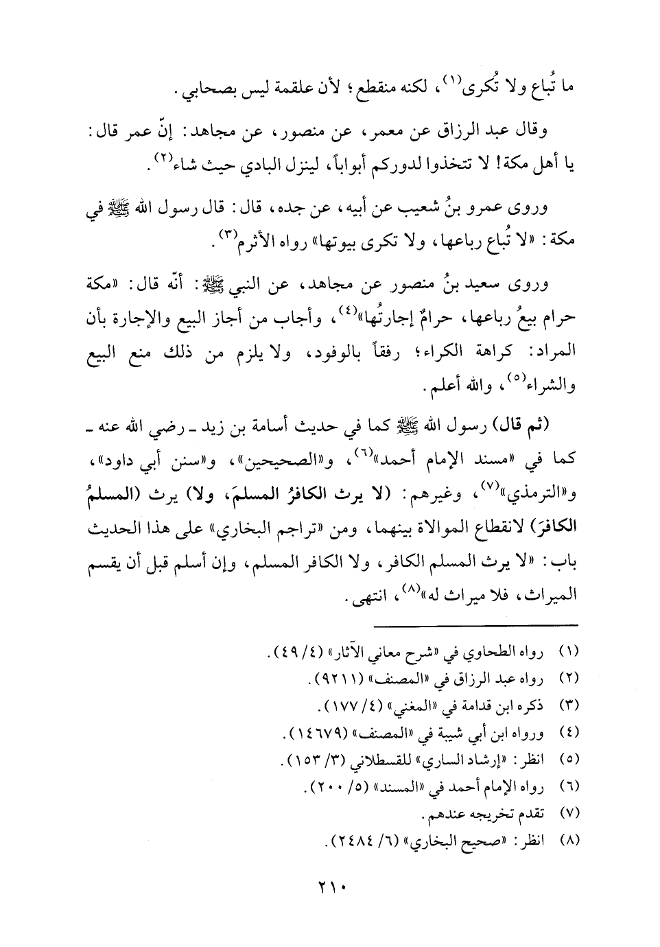 وروى سعيد بنُ منصور عن مجاهد، عن النبي - صلى الله عليه وسلم -: أنّه قال: "مكة حرام بيعُ رباعها، حرامٌ إجارتُها" (٤)، وأجاب من أجاز البيع والإجارة بأن المراد: كراهة الكراء، رفقًا بالوفود، ولا يلزم من ذلك منع البيع والشراء (٥)، والله أعلم.