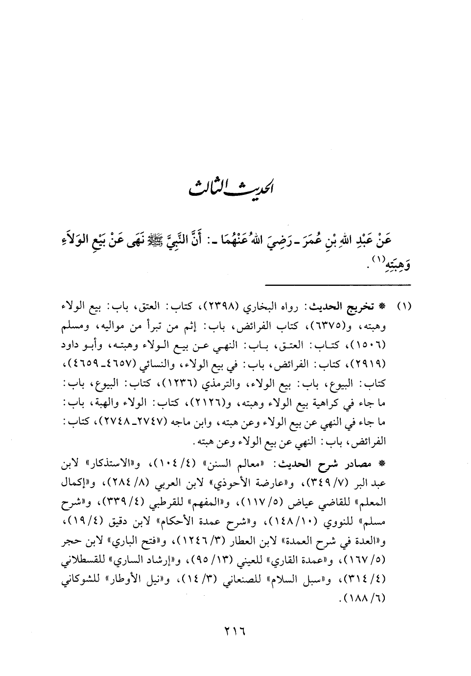 رواه البخاري (٢٣٩٨)، كتاب: العتق، باب: بيع الولاء وهبته، و (٦٣٧٥)، كتاب الفرائض، باب: إثم من تبرأ من مواليه، ومسلم (١٥٠٦)، كتاب: العتق، باب: النهي عن بيع الولاء وهبته، وأبو داود (٢٩١٩)، كتاب: الفرائض، باب: في بيع الولاء، والنسائي (٤٦٥٧ - ٤٦٥٩)، كتاب: البيوع، باب: بيع الولاء، والترمذي (١٢٣٦)، كتاب: البيوع، باب: ما جاء في كراهية بيع الولاء وهبته، و (٢١٢٦)، كتاب: الولاء والهبة، باب: ما جاء في النهي عن بيع الولاء وعن هبته، وابن ماجة (٢٧٤٧ - ٢٧٤٨)، كتاب: الفرائض، باب: النهي عن بيع الولاء وعن هبته.