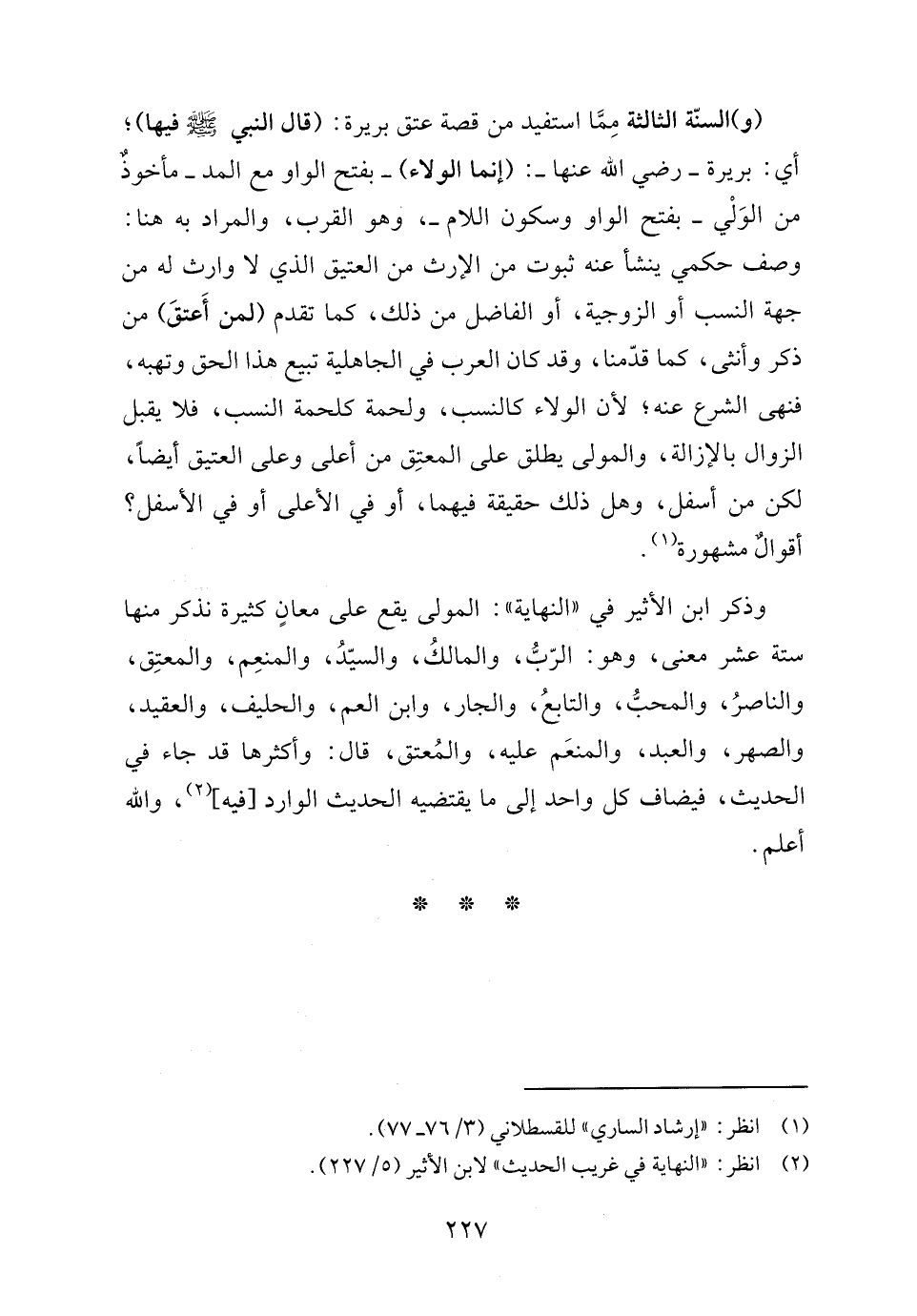 (و) السنّة الثالثة مِمَّا استفيد من قصة عتق بريرة: (قال النبي - صلى الله عليه وسلم - فيها)؛ أي: بريرة - رضي الله عنها -: (إنما الولاء) -بفتح الواو مع المد- مأخوذٌ من الوَلْي -بفتح الواو وسكون اللام-، وهو القرب، والمراد به هنا: وصف حكمي ينشأ عنه ثبوت من الإرث من العتيق الذي لا وارث له من جهة النسب أو الزوجية، أو الفاضل من ذلك، كما تقدم (لمن أَعتقَ) من ذكر وأنثى، كما قدّمنا، وقد كان العرب في الجاهلية تبيع هذا الحق وتهبه، فنهى الشرع عنه؛ لأن الولاء كالنسب، ولحمة كلحمة النسب، فلا يقبل الزوال بالإزالة، والمولى يطلق على المعتِق من أعلى وعلى العتيق أيضًا، لكن من أسفل، وهل ذلك حقيقة فيهما، أو في الأعلى أو في الأسفل؟ أقوالٌ مشهورة (١).