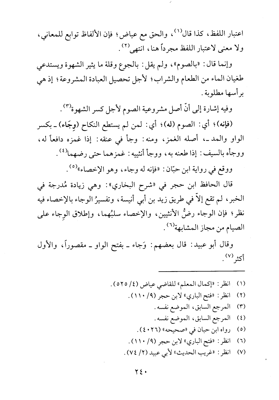 قال: الحافظ ابن حجر في "شرح البخاري": وهي زيادة مُدرجة في الخبر، لم تقع إلّا في طريق زيد بن أبي أنيسة، وتفسيرُ الوجاء بالإخصاء فيه نظر، فإن الوجاء رضُّ الأنثيين، والإخصاء سلبُهما، وإطلاق الوِجاء على الصيام من مجاز المشابهة (٦).