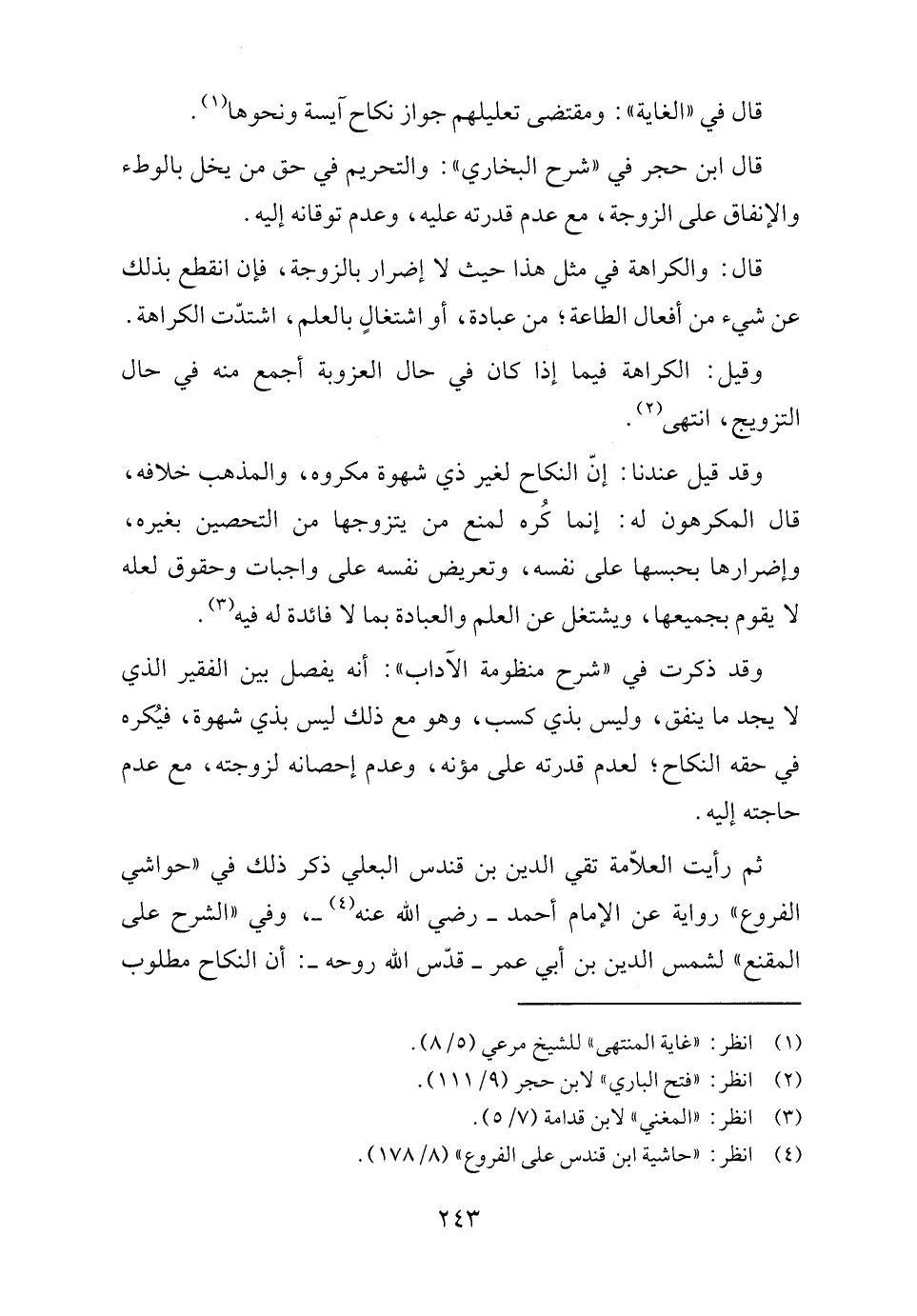 ثم رأيت العلّامة تقي الدين بن قندس البعلي ذكر ذلك في "حواشي الفروع" رواية عن الإمام أحمد - رضي الله عنه (٤) -، وفي "الشرح على المقنع" لشمس الدين بن أبي عمر -قدّس الله روحه-: أن النكاح مطلوب