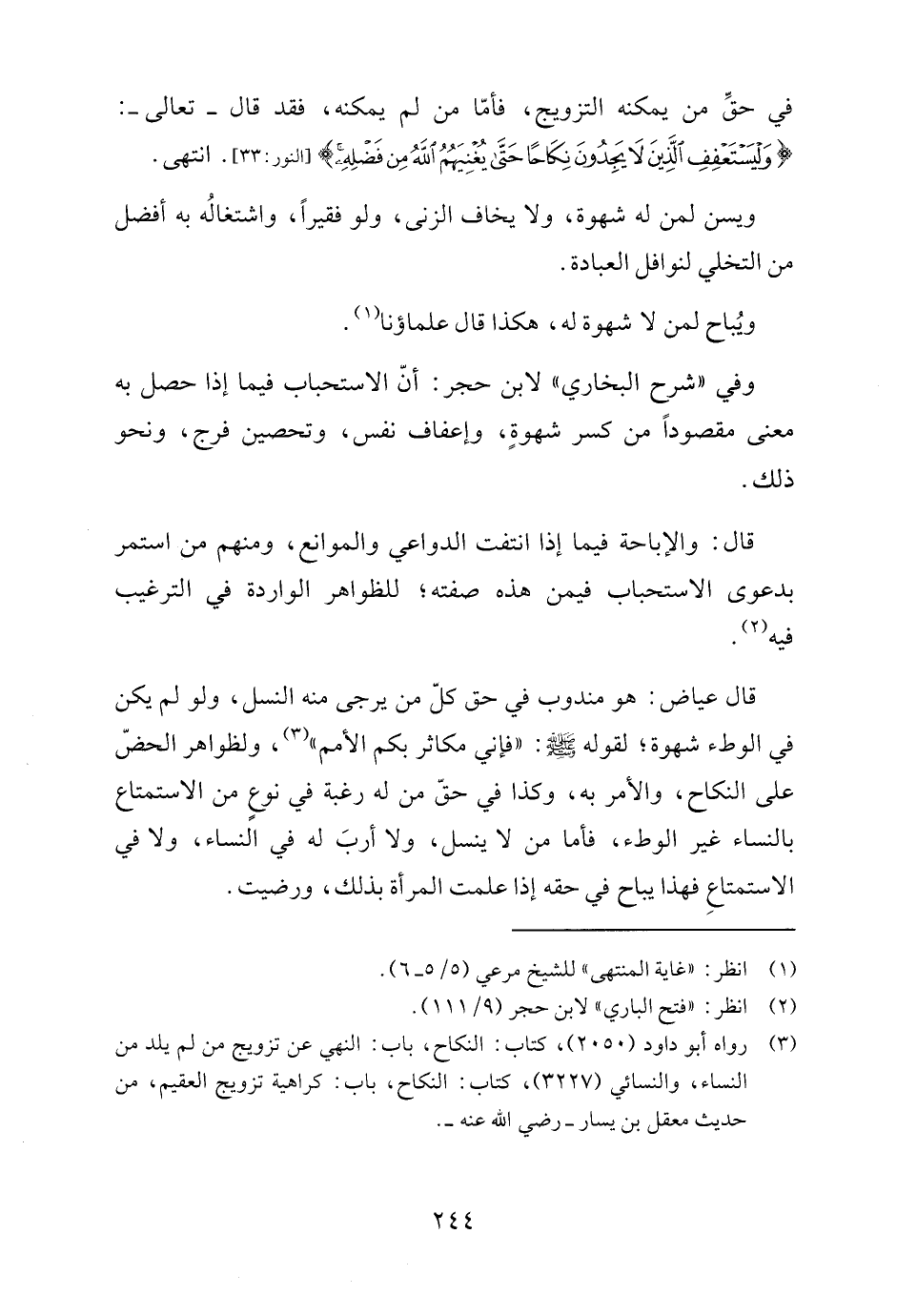وفي "شرح البخاري" لابن حجر: أنّ الاستحباب فيما إذا حصل به معنى مقصودًا من كسر شهوةٍ، وإعفاف نفس، وتحصين فرج، ونحو ذلك.