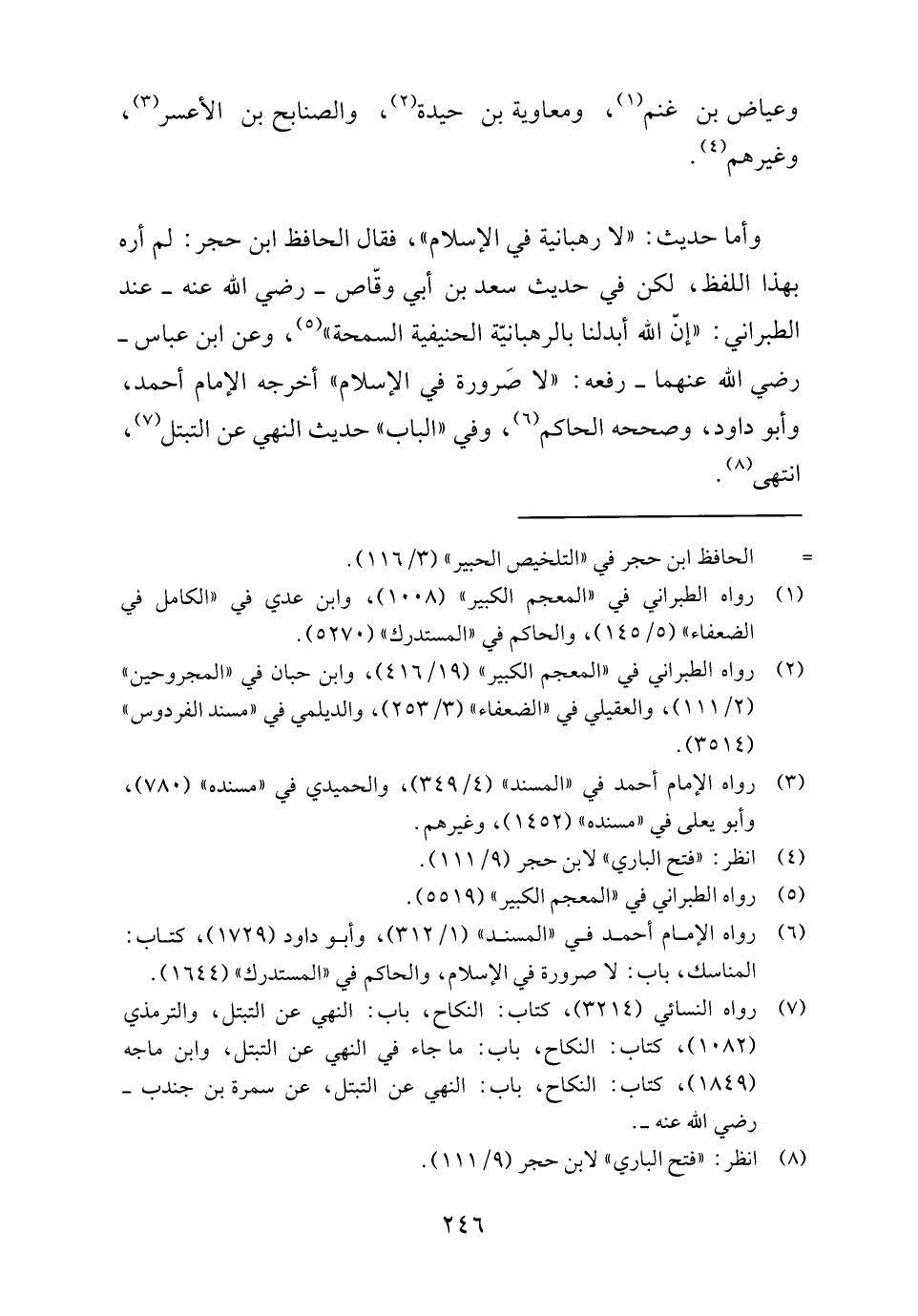 وأما حديث: "لا رهبانية في الإسلام"، فقال: الحافظ ابن حجر: لم أره بهذا اللفظ، لكن في حديث سعد بن أبي وقّاص - رضي الله عنه - عند الطبراني: "إنّ الله أبدلنا بالرهبانية الحنيفية السمحة" (٥)، وعن ابن عباس - رضي الله عنهما - رفعه: "لا صَرورة في الإسلام" أخرجه الإمام أحمد، وأبو داود، وصححه الحاكم (٦)، وفي "الباب" حديث النهي عن التبتل (٧)، انتهى (٨).