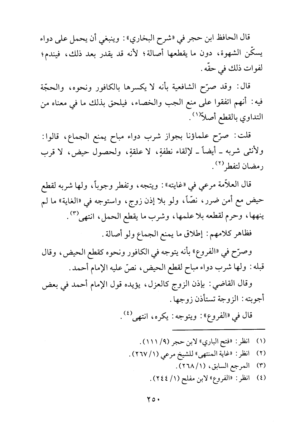 قال العلّامة مرعي في "غايته": ويتجه، وتفطر وجوبًا، ولها شربه لقطع حيض مع أمن ضرر، نصًّا، ولو بلا إذن زوج، واستوجه في "الغاية" ما لم ينهها، وحرم لقطعه بلا علمها، وشرب ما يقطع الحمل، انتهى (٣).