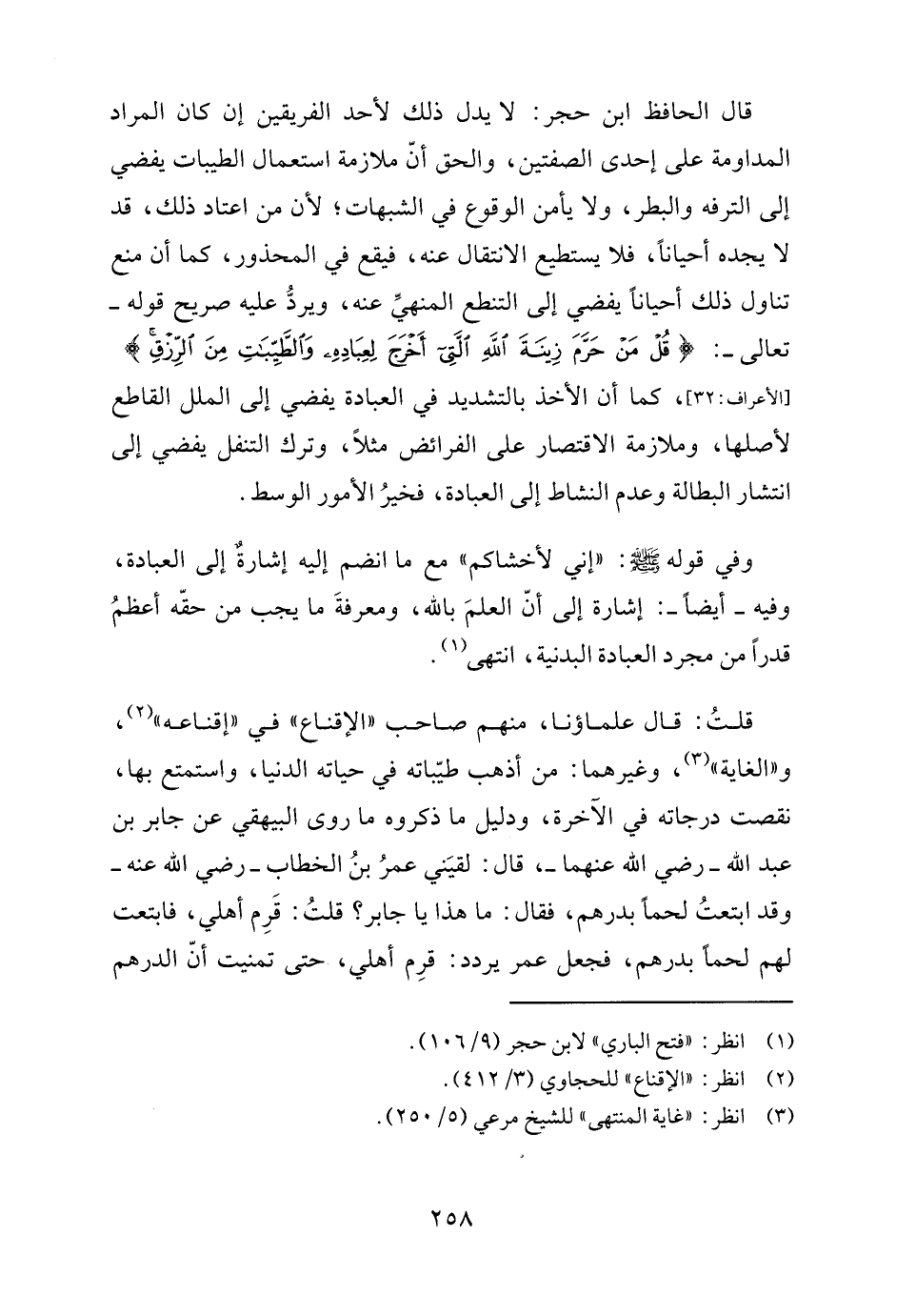 قلتُ: قال علماؤنا، منهم صاحب "الإقناع" في "إقناعه" (٢)، و"الغاية" (٣)، وغيرهما: من أذهب طيّباته في حياته الدنيا، واستمتع بها، نقصت درجاته في الآخرة، ودليل ما ذكروه ما روى البيهقي عن جابر بن عبد الله - رضي الله عنهما -، قال: لقيَني عمرُ بنُ الخطاب - رضي الله عنه - وقد ابتعتُ لحمًا بدرهم، فقال: ما هذا يا جابر؟ قلتُ: قَرِم أهلي، فابتعت لهم لحمًا بدرهم، فجعل عمر يردد: قرِم أهلي، حتى تمنيت أنّ الدرهم