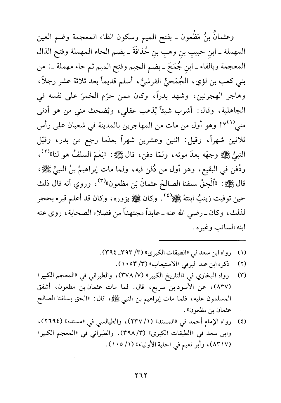 (٣) رواه البخاري في "التاريخ الكبير" (٧/ ٣٧٨)، والطبراني في "المعجم الكبير" (٨٣٧)، عن الأسود بن سريع، قال: لما مات عثمان بن مظعون، أشفق المسلمون عليه، فلما مات إبراهيم بن النبي - صلى الله عليه وسلم -، قال: "الحق بسلفنا الصالح عثمان بن مظعون".