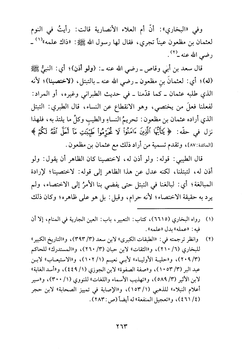 قال سعد بن أبي وقاص - رضي الله عنه -: (ولو أذن)، أي: النبيُّ - صلى الله عليه وسلم - (له)، أي: لعثمانَ بنِ مظعون - رضي الله عنه - بالتبتل، (لاختصينا)؛ لأنه الذي طلبه عثمان -كما قدّمنا- في حديث الطبراني وغيره، أو المراد: لفعلنا فعلَ من يختصي، وهو الانقطاع عن النساء، قال الطبري: التبتل الذي أراده عثمان بن مظعون: تحريمُ النساءِ والطيبِ وكلِّ ما يلتذ به، فلهذا نزل في حقّه: {يَاأَيُّهَا الَّذِينَ آمَنُوا لَا تُحَرِّمُوا طَيِّبَاتِ مَا أَحَلَّ اللَّهُ لَكُمْ} [المائدة: ٨٧]، وتقدم تَسمية من أراد ذلك مع عثمان بن مظعون.