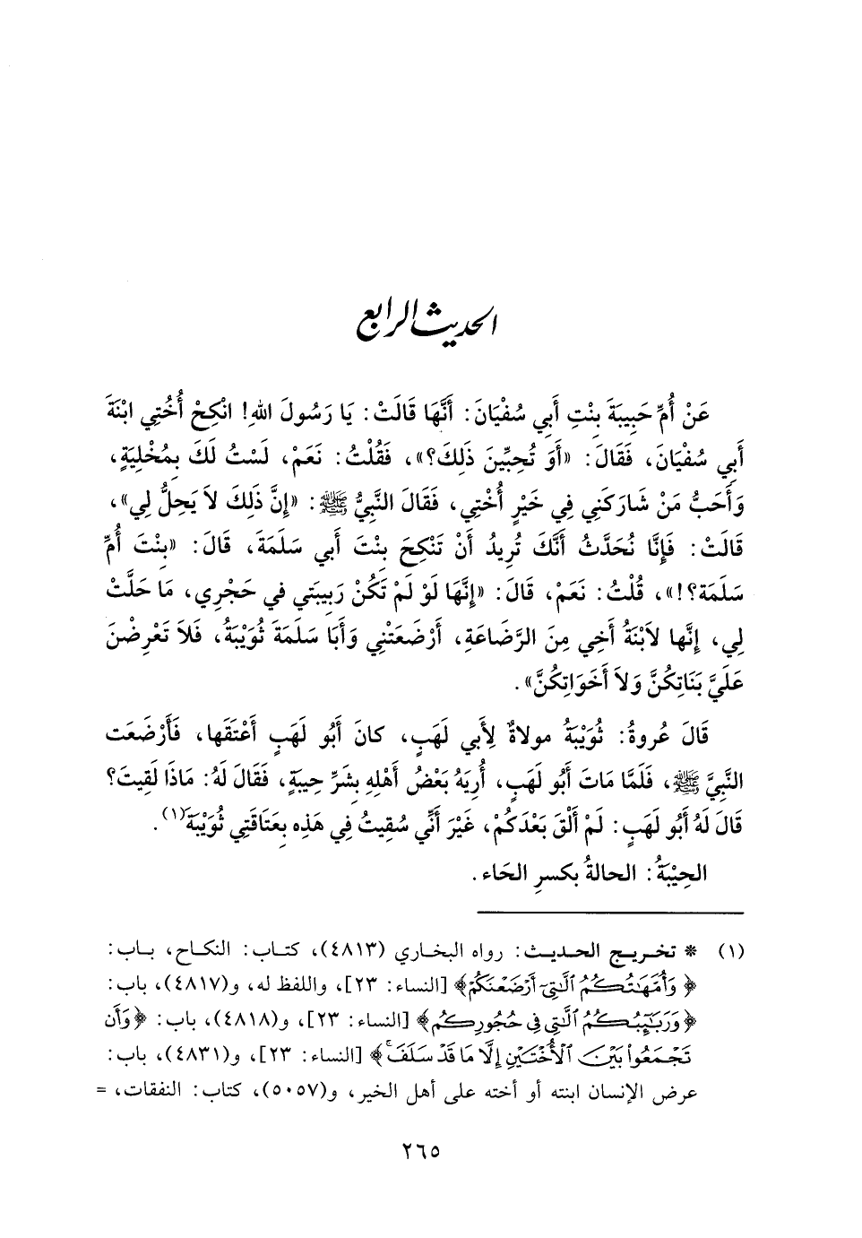 عَنْ أُمِّ حَبِيبَةَ بنْتِ أَبِي سُفْيَانَ: أَنَّهَا قَالَتْ: يَا رَسُولَ اللهِ! انْكِحْ أُخُتِي ابْنَةَ أَبي سُفْيَانَ، فَقَالَ: "أَوَ تُحِبِّينَ ذَلِكَ؟ "، فَقُلْتُ: نَعَمْ، لَسْتُ لَكَ بمُخْلِيَةٍ، وَأَحَبُّ مَنْ شَارَكَنِي فِي خَيْرٍ أُخْتِي، فَقَالَ النَّبِيُّ - صلى الله عليه وسلم -: "إِنَّ ذَلِكَ لَا يَحَلُّ لِي"، قَالَتْ: فَإِنَّا نُحَدَّثُ أَنَّكَ تُرِيدُ أَنْ تَنْكِحَ بنْتَ أَبي سَلَمَةَ، قَالَ: "بنْتَ أُمِّ سَلَمَة؟! "، قُلْتُ: نَعَمْ، قَالَ: "إِنَّهَا لَوْ لَمْ تكُنْ رَبِيبَتي في حَجْرِي، مَا حَلَّتْ لِي، إِنَّها لَابْنَةُ أَخِي مِنَ الرَّضَاعَةِ، أَرْضَعَتْنِي وَأَبَا سَلَمَةَ ثُوَيْبَةُ، فَلَا تَعْرِضْنَ عَلَيَّ بَنَاتِكُنَّ وَلَا أَخَوَاتِكُنَّ".