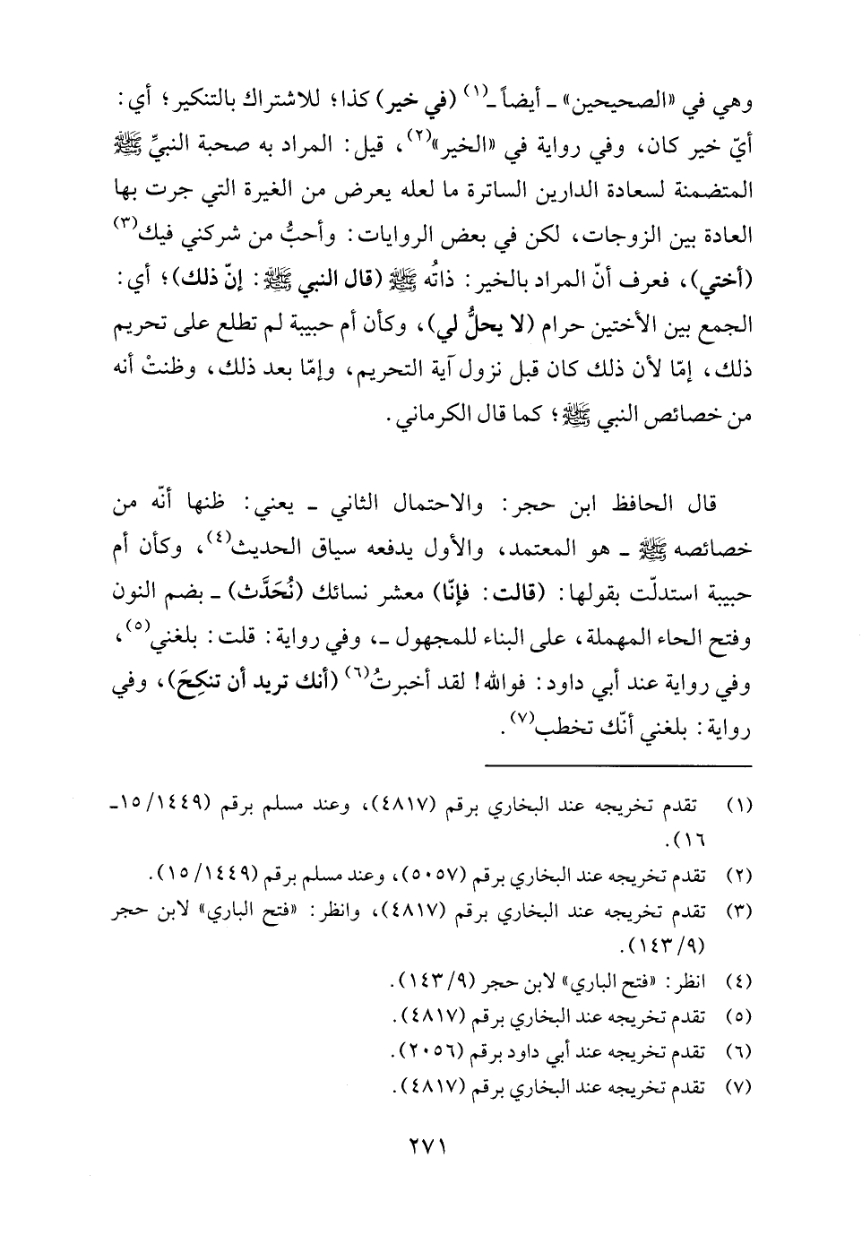 قال الحافظ ابن حجر: والاحتمال الثاني -يعني: ظنها أنّه من خصائصه - صلى الله عليه وسلم -- هو المعتمد، والأول يدفعه سياق الحديث (٤)، وكأن أم حبيبة استدلّت بقولها: (قالت: فإنّا) معشر نسائك (نُحَدَّث) -بضم النون وفتح الحاء المهملة، على البناء للمجهول-، وفي رواية: قلت: بلغني (٥)، وفي رواية عند أبي داود: فوالله! لقد أخبرتُ (٦) (أنك تريد أن تنكِحَ)، وفي رواية: بلغني أنّك تخطب (٧).