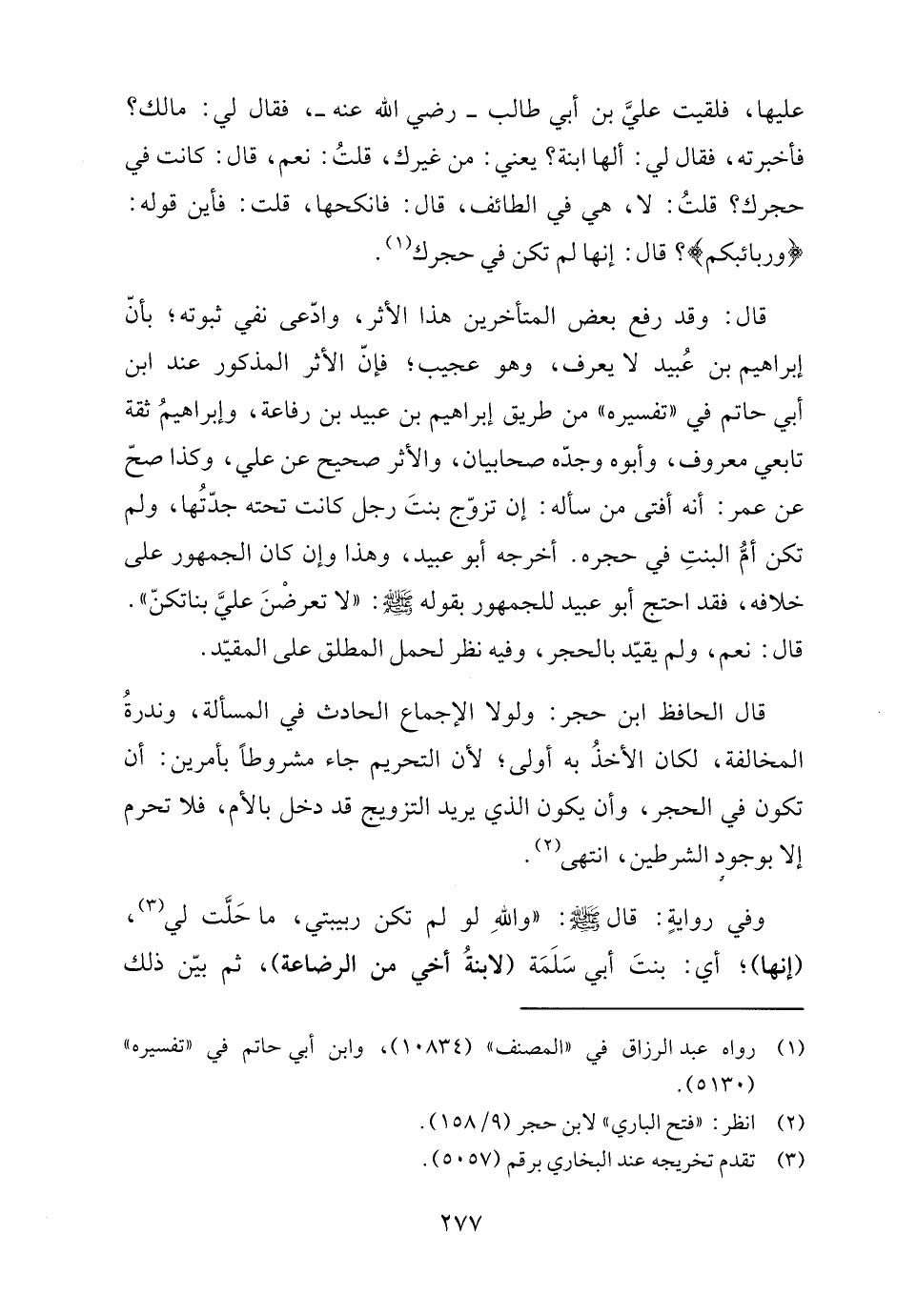 قال: وقد رفع بعض المتأخرين هذا الأثر، وادّعى نفي ثبوته، بأنّ إبراهيم بن عُبيد لا يعرف، وهو عجيب، فإنّ الأثر المذكور عند ابن أبي حاتم في "تفسيره" من طريق إبراهيم بن عبيد بن رفاعة، وإبراهيمُ ثقة تابعي معروف، وأبوه وجدّه صحابيان، والأثر صحيح عن علي، وكذا صحّ عن عمر: أنه أفتى من سأله: إن تزوّج بنتَ رجل كانت تحته جدّتُها، ولم تكن أمُّ البنتِ في حجره. أخرجه أبو عبيد، وهذا وإن كان الجمهور على خلافه، فقد احتج أبو عبيد للجمهور بقوله - صلى الله عليه وسلم -: "لا تعرضْنَ عليَّ بناتكنّ". قال: نعم، ولم يقيّد بالحجر، وفيه نظر لحمل المطلق على المقيّد.