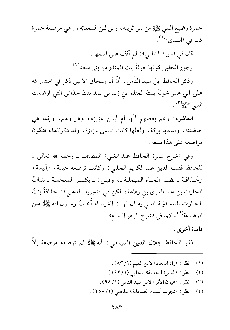 وفي "شرح سيرة الحافظ عبد الغني" المصنفِ -رحمه الله تعالى- للحافظ قطب الدين عبد الكريم الحلبي: وكانت ترضعه حبيبة، وأنيسة، وحُذافة -بضم الحاء المهملة-، وقيل: -بكسر المعجمة- بناتُ الحارث بن عبد العزى بنِ رفاعة، لكن في "تجريد الذهبي": حذافةُ بنتُ الحارث السعديّة التي يقال لها: الشيماء أُختُ رسول الله - صلى الله عليه وسلم - من الرضاعة (٤)، كما في "شرح الزهر البسام".