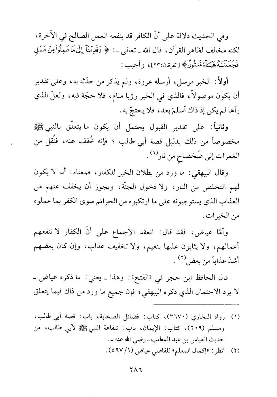 وأما عياض، فقد قال: انعقد الإجماع على أنّ الكفار لا تنفعهم أعمالهم، ولا يثابون عليها بنعيم، ولا تخفيف عذاب، وإن كان بعضهم أشدّ عذابًا من بعض (٢).