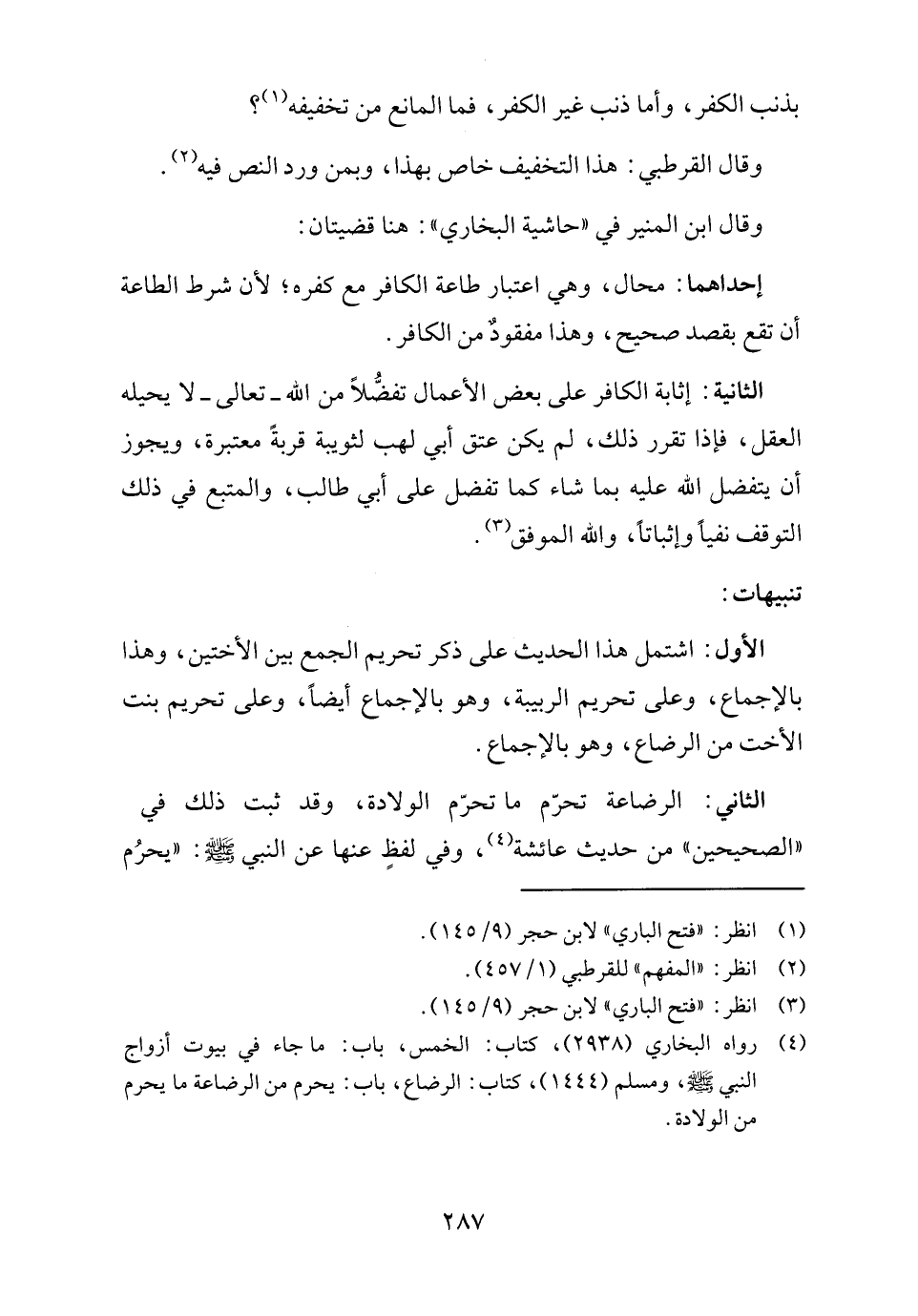 (٤) رواه البخاري (٢٩٣٨)، كتاب: الخمس، باب: ما جاء في بيوت أزواج النبي - صلى الله عليه وسلم -، ومسلم (١٤٤٤)، كتاب: الرضاع، باب: يحرم من الرضاعة ما يحرم من الولادة.