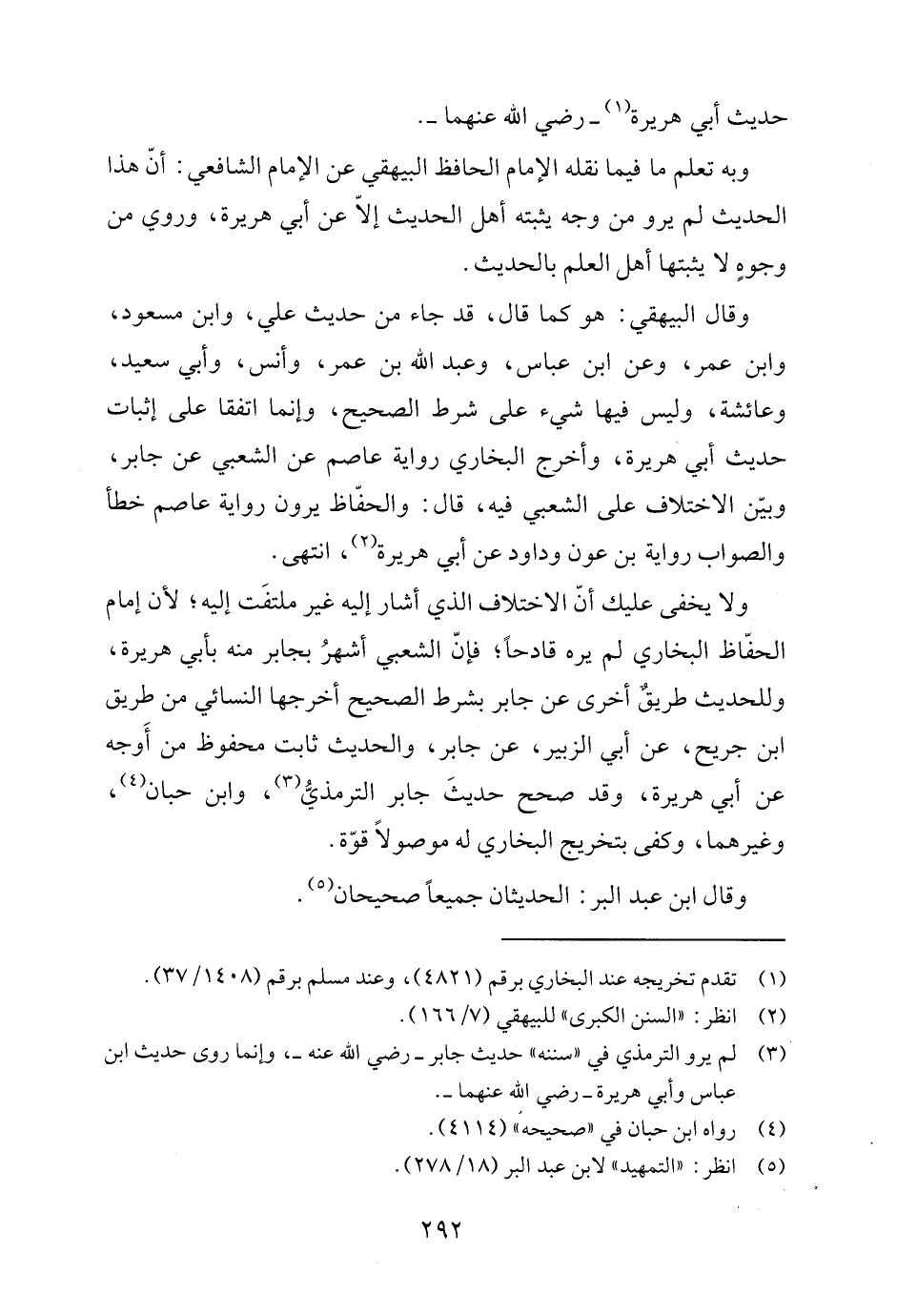 وقال: البيهقي: هو كما قاله، قد جاء من حديث علي، وابن مسعود، وابن عمر، وعن ابن عباس، وعبد الله بن عمر، وأنس، وأبي سعيد، وعائشة، وليس فيها شيء على شرط الصّحيح، وإنما اتفقا على إثبات حديث أبي هريرة، وأخرج البخاري رواية عاصم عن الشعبي عن جابر، وبيّن الاختلاف على الشعبي فيه، قال: والحفّاظ يرون رواية عاصم خطأ والصواب رواية بن عون وداود عن أبي هريرة (٢)، انتهى.