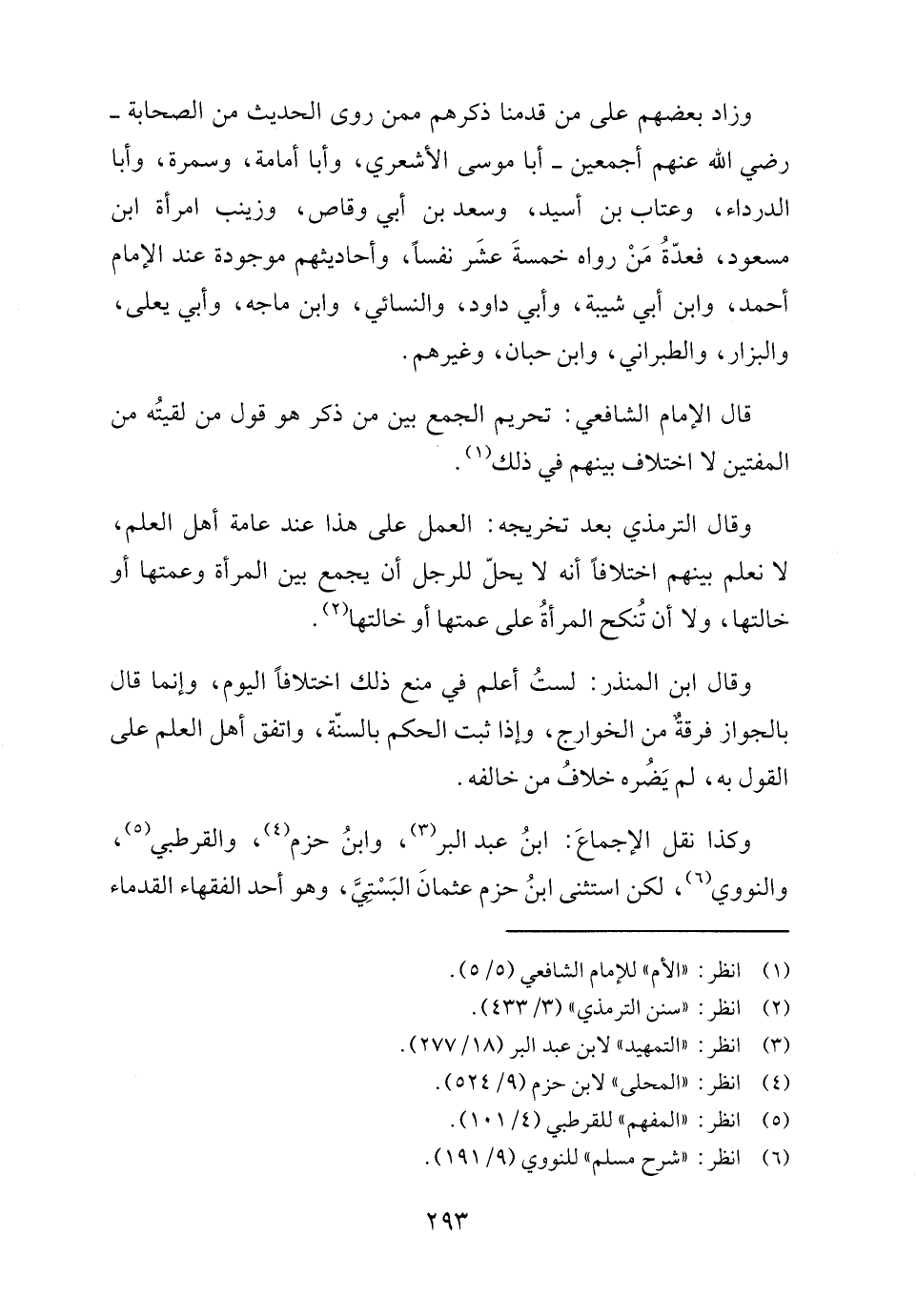 وقال الترمذي بعد تخريجه: العمل على هذا عند عامة أهل العلم، لا نعلم بينهم اختلافًا أنه لا يحلّ للرجل أن يجمع بين المرأة وعمتها أو خالتها، ولا أن تُنكح المرأةُ على عمتها أو خالتها (٢).