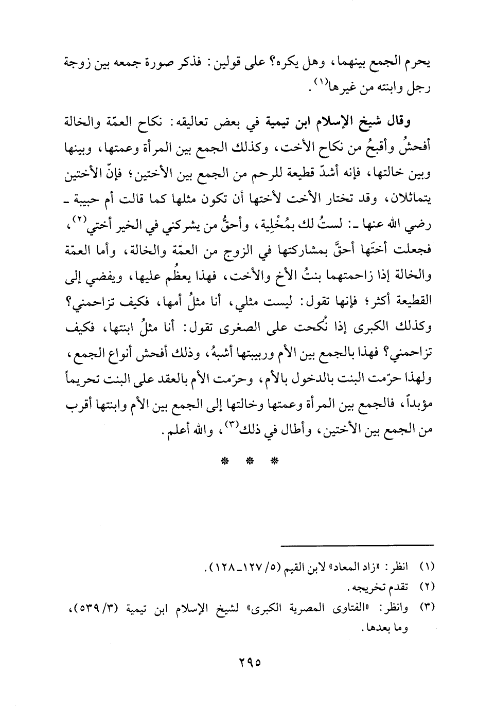 وقال شيخ الإسلام ابن تيمية في بعض تعاليقه: نكاح العمّة والخالة أفحشُ وأقبحُ من نكاح الأخت، وكذلك الجمع بين المرأة وعمتها، وبينها وبين خالتها، فإنه أشدّ قطيعة للرحم من الجمع بين الأختين، فإنّ الأختين يتماثلان، وقد تختار الأخت لأختها أن تكون مثلها كما قالت أم حبيبة - رضي الله عنها -: لستُ لك بمُخْلِية، وأحقُّ من يشركني في الخير أختي (٢)، فجعلت أختَها أحقَّ بمشاركتها في الزوج من العمّة والخالة، وأما العمّة والخالة إذا زاحمتهما بنتُ الأخ والأخت، فهذا يعظُم عليها، ويفضي إلى