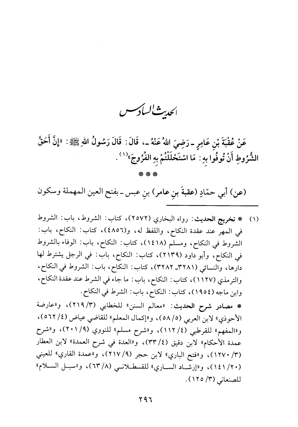 عَنْ عُقْبَةَ بْنِ عَامِرٍ - رَضِيَ اللهُ عَنْهُ -، قَالَ: قَالَ رَسُولُ اللهِ - صلى الله عليه وسلم -: "إِنَّ أَحَقَّ الشُرُوطِ أَنْ تُوفُوا بِهِ: مَا اسْتَحْلَلْتُمْ بِهِ الفُرُوجَ" (١).
