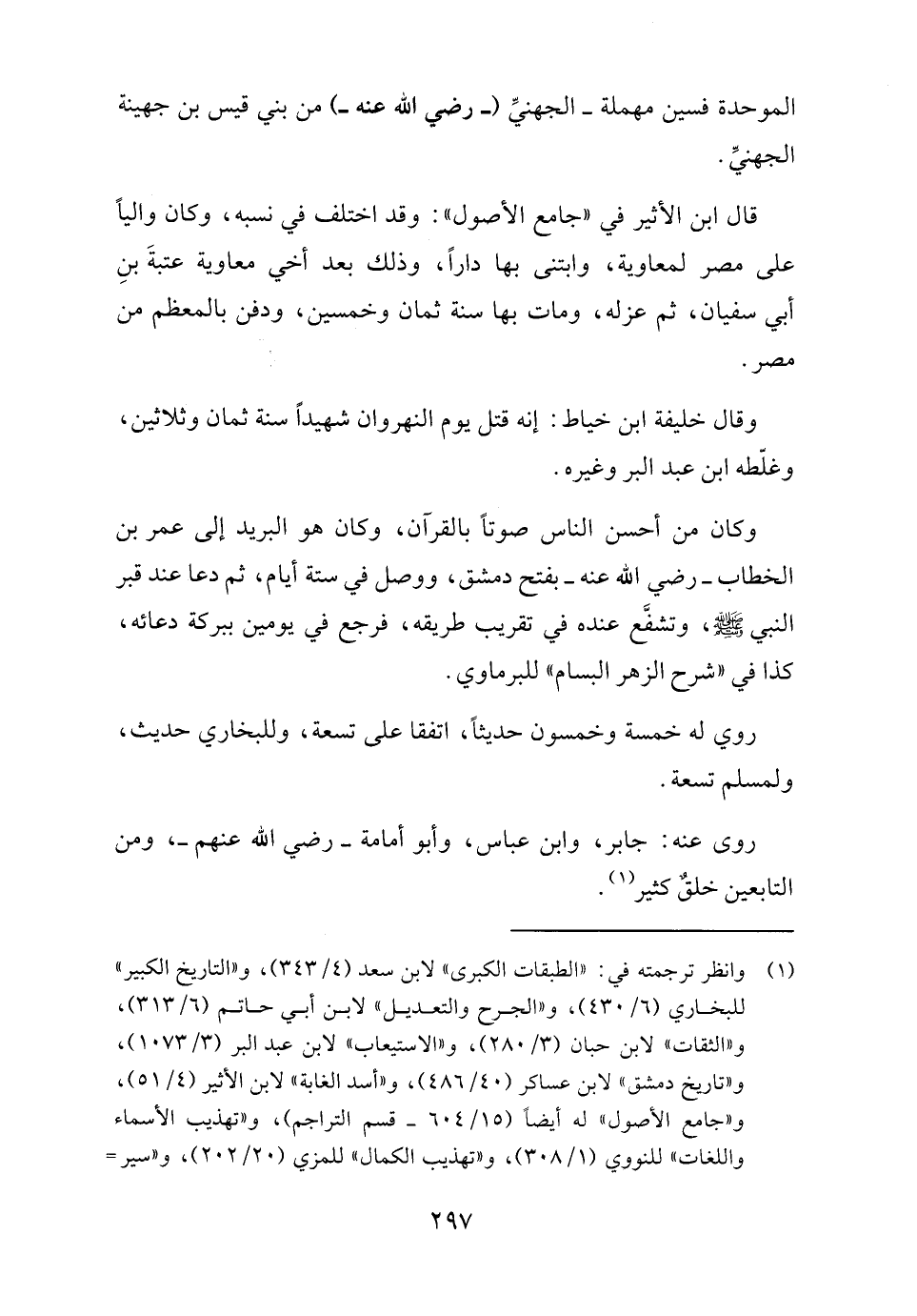 (١) وانظر ترجمته في: "الطبقات الكبرى" لابن سعد (٤/ ٣٤٣)، و"التاريخ الكبير" للبخاري (٦/ ٤٣٠)، و"الجرح والتعديل" لابن أبي حاتم (٦/ ٣١٣)، و"الثقات" لابن حبان (٣/ ٢٨٠)، و"الاستيعاب" لابن عبد البر (٣/ ١٠٧٣)، و"تاريخ دمشق" لابن عساكر (٤٠/ ٤٨٦)، و"أسد الغابة" لابن الأثير (٤/ ٥١)، و"جامع الأصول" له أيضًا (١٥/ ٦٠٤ - قسم التراجم)، و"تهذيب الأسماء واللغات" للنووي (١/ ٣٠٨)، و"تهذيب الكمال" للمزي (٢٠/ ٢٠٢)، و"سير =