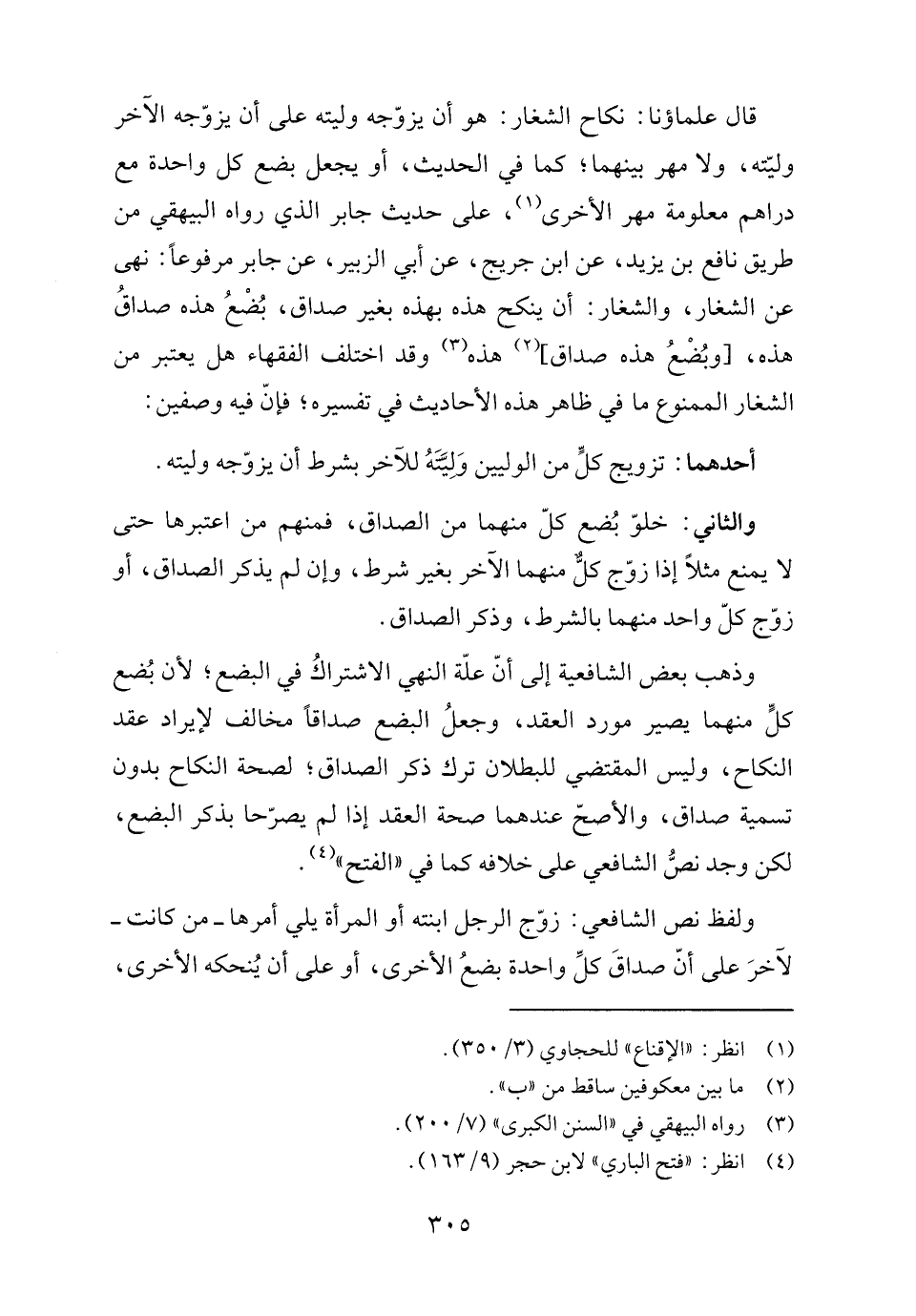 قال علماؤنا: نكاح الشغار: هو أن يزوّجه وليته على أن يزوّجه الآخر وليّته، ولا مهر بينهما، كما في الحديث، أو يجعل بضع كل واحدة مع دراهم معلومة مهر الأخرى (١)، على حديث جابر الّذي رواه البيهقي من طريق نافع بن يزيد، عن ابن جريج، عن أبي الزبير، عن جابر مرفوعًا: نهى عن الشغار، والشغار: أن ينكح هذه بهذه بغير صداق، بُضْعُ هذه صداقُ هذه، [وبُضْعُ هذه صداق] (٢) هذه (٣) وقد اختلف الفقهاء هل يعتبر من الشغار الممنوع ما في ظاهر هذه الأحاديث في تفسيره، فإنّ فيه وصفين: