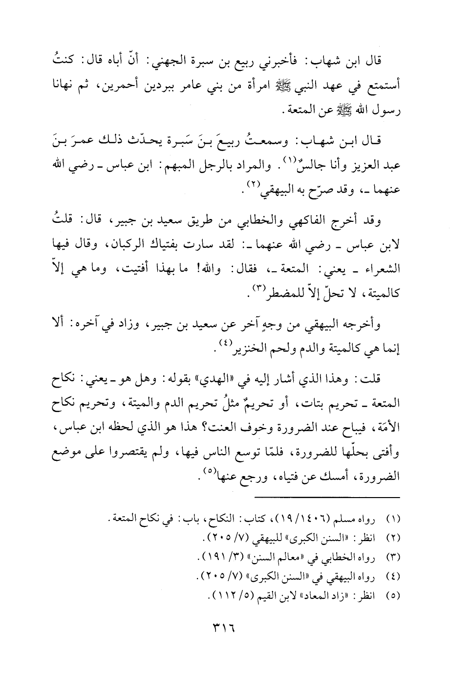 قلت: وهذا الذي أشار إليه في "الهدي" بقوله: وهل هو -يعني: نكاح المتعة- تحريم بتات، أو تحريمٌ مثلُ تحريم الدم والميتة، وتحريم نكاح الأمَة، فيباح عند الضرورة وخوف العنت؟ هذا هو الذي لحظه ابن عباس، وأفتى بحلّها للضرورة، فلمّا توسع الناس فيها، ولم يقتصروا على موضع الضرورة، أمسك عن فتياه، ورجع عنها (٥).
