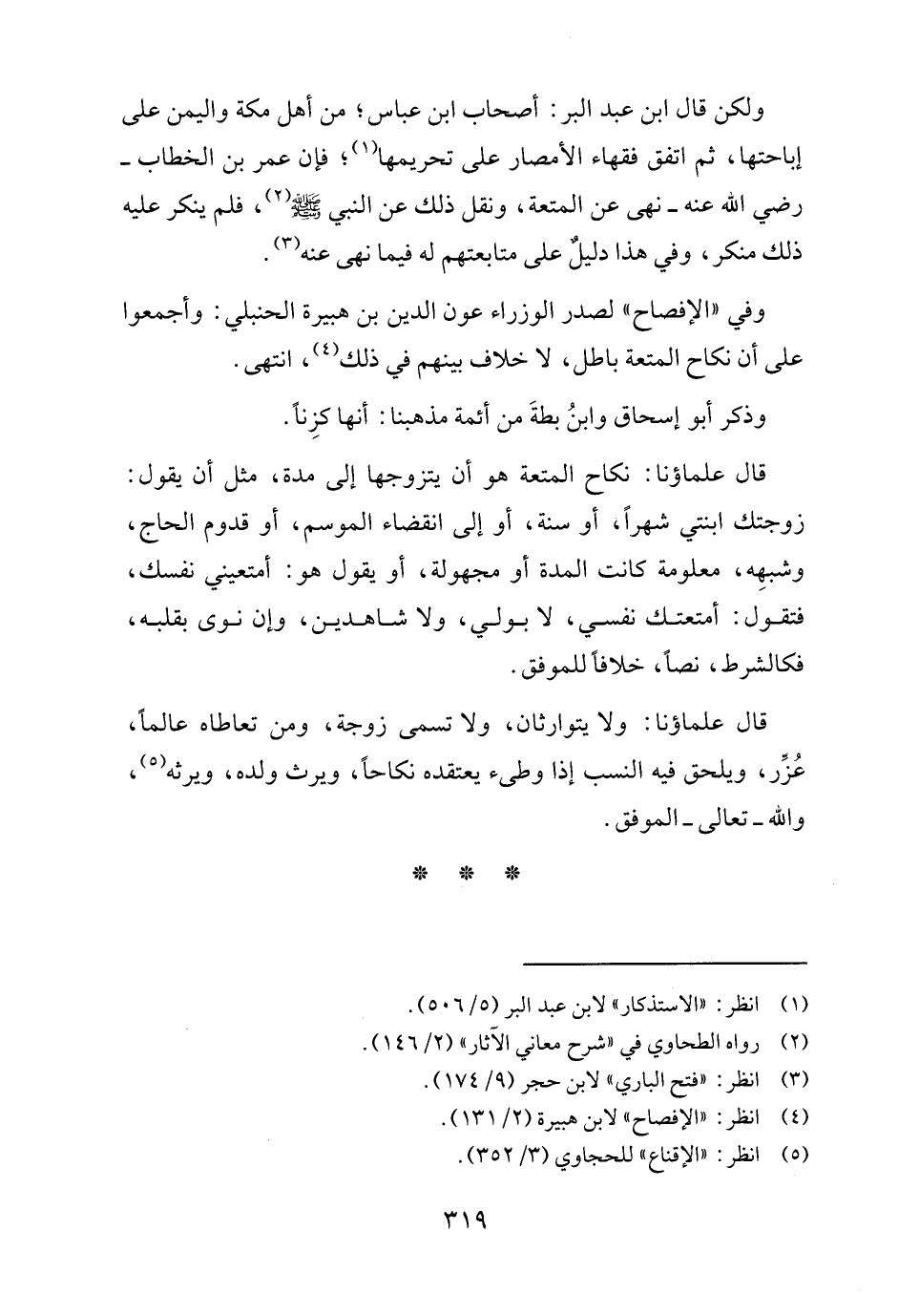 وفي "الإفصاح" لصدر الوزراء عون الدين بن هبيرة الحنبلي: وأجمعوا على أن نكاح المتعة باطل، لا خلاف بينهم في ذلك (٤)، انتهى.
