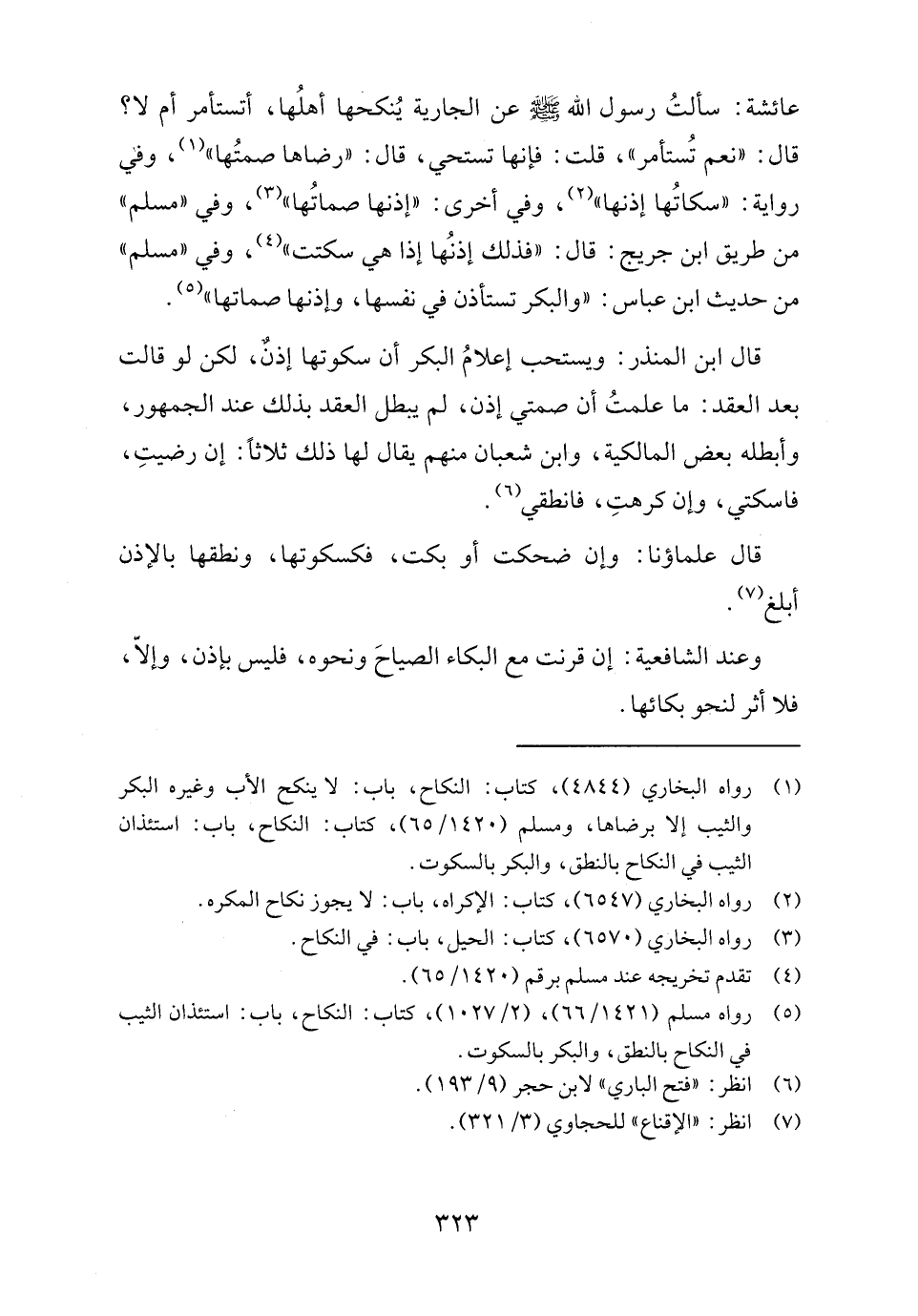 (٥) رواه مسلم (١٤٢١/ ٦٦)، (٢/ ١٠٢٧)، كتاب: النكاح، باب: استئذان الثيب في النكاح بالنطق، والبكر بالسكوت.