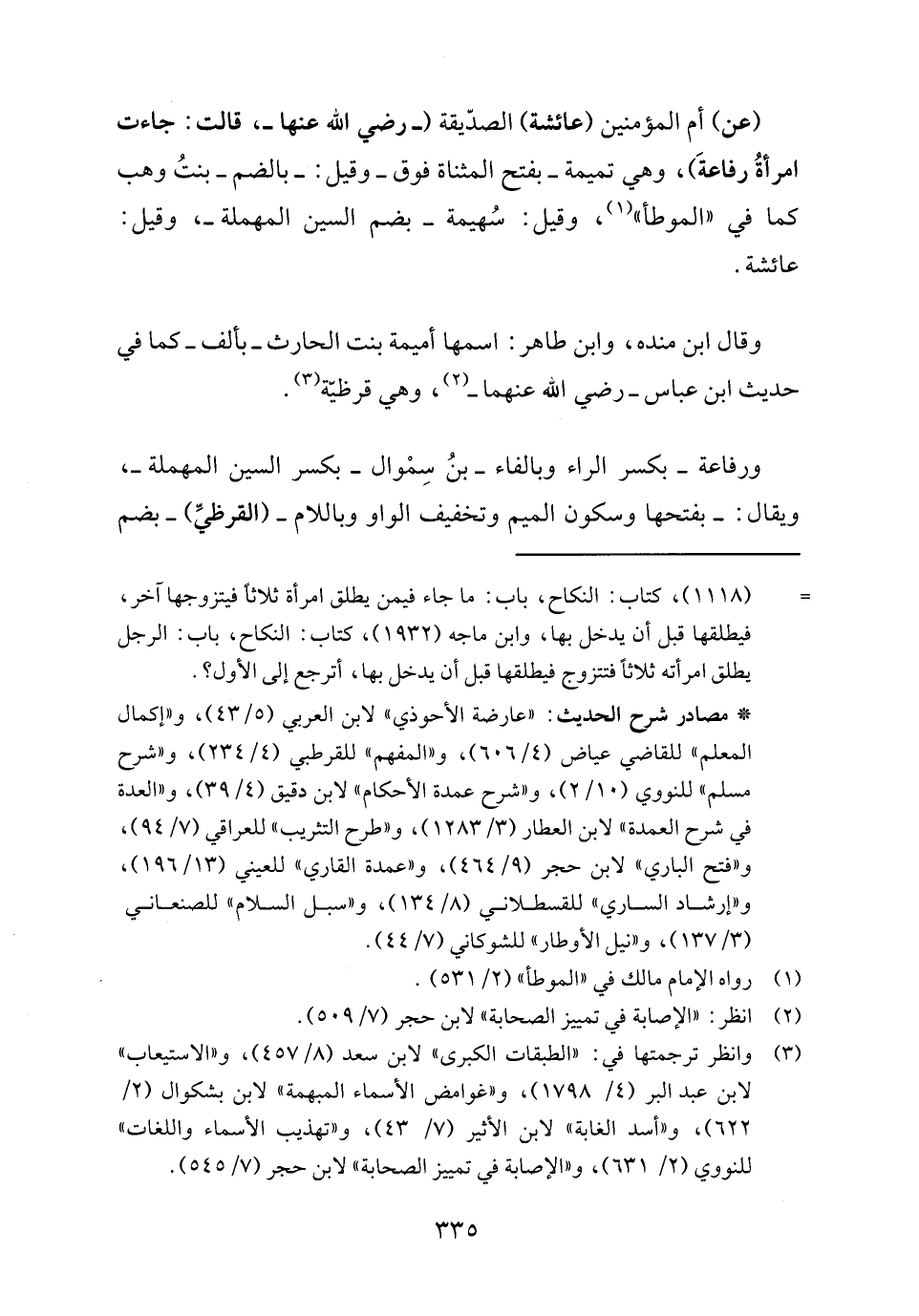 (عن) أم المؤمنين (عائشة) الصدّيقة (- رضي الله عنها -، قالت: جاءت امرأةُ رفاعةَ)، وهي تميمة -بفتح المثناة فوق- وقيل: -بالضم- بنتُ وهب كما في "الموطأ" (١)، وقيل: سُهيمة -بضم السين المهملة-، وقيل: عائشة.