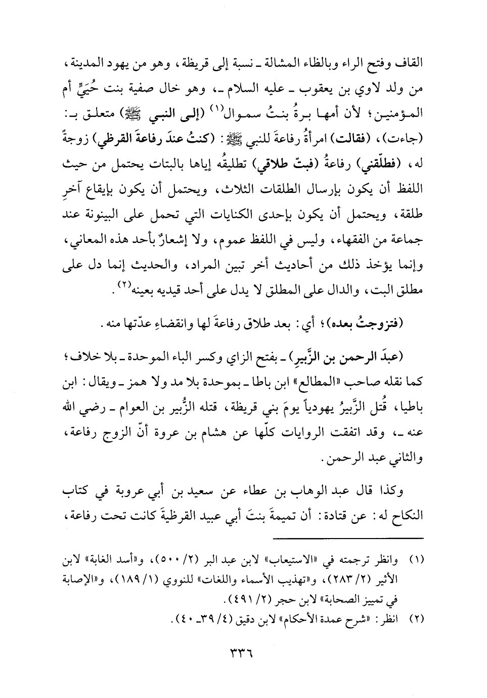 (عبدَ الرحمن بن الزَّبيرِ) -بفتح الزاي وكسر الباء الموحدة- بلا خلاف، كما نقله صاحب "المطالع" ابن باطا -بموحدة بلا مد ولا همز- ويقال: ابن باطيا، قُتل الزُّبيرُ يهوديًا يومَ بني قريظة، قتله الزُّبير بن العوام - رضي الله عنه -، وقد اتفقت الروايات كلّها عن هشام بن عروة أنّ الزوج رفاعة، والثاني عبد الرحمن.