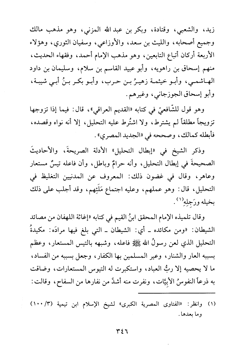 وقال تلميذه الإمام المحقق ابنُ القيم في كتابه "إغاثة اللهفان من مصائد الشيطان: "ومن مكائده -أي: الشيطان- التي بلغ فيها مرادَه: مكيدةُ التحليل الذي لعن رسولُ الله - صلى الله عليه وسلم - فاعله، وشبهه بالتيس المستعار، وعظم بسببه العار والشنار، وعير المسلمين بها الكفار، وجعل بسببه من الفساد، ما لا يحصيه إلا ربُّ العباد، واستكبرت له التيوس المستعارات، وضاقت به ذرعًا النفوسُ الأبِيَّات، ونفرت منه أشدَّ من نفارها من السفاح، وقالت: