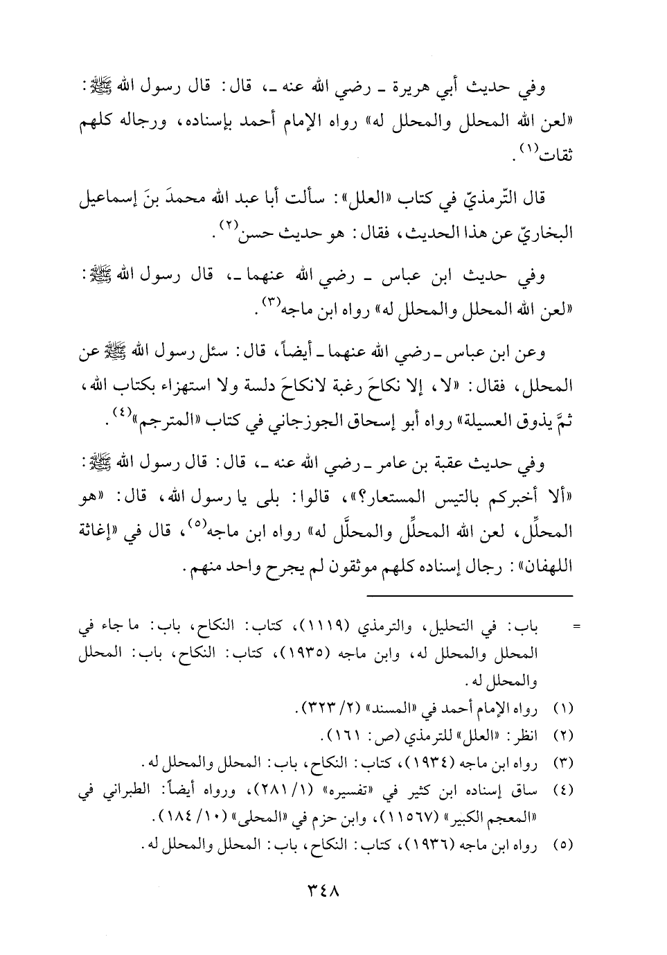 وفي حديث عقبة بن عامر - رضي الله عنه -، قال: قال رسول الله - صلى الله عليه وسلم -: "ألا أخبركم بالتيس المستعار؟ "، قالوا: بلى يا رسول الله، قال: "هو المحلِّل، لعن الله المحلِّل والمحلَّل له" رواه ابن ماجه (٥)، قال في "إغاثة اللهفان": رجال إسناده كلهم موثقون لم يجرح واحد منهم.