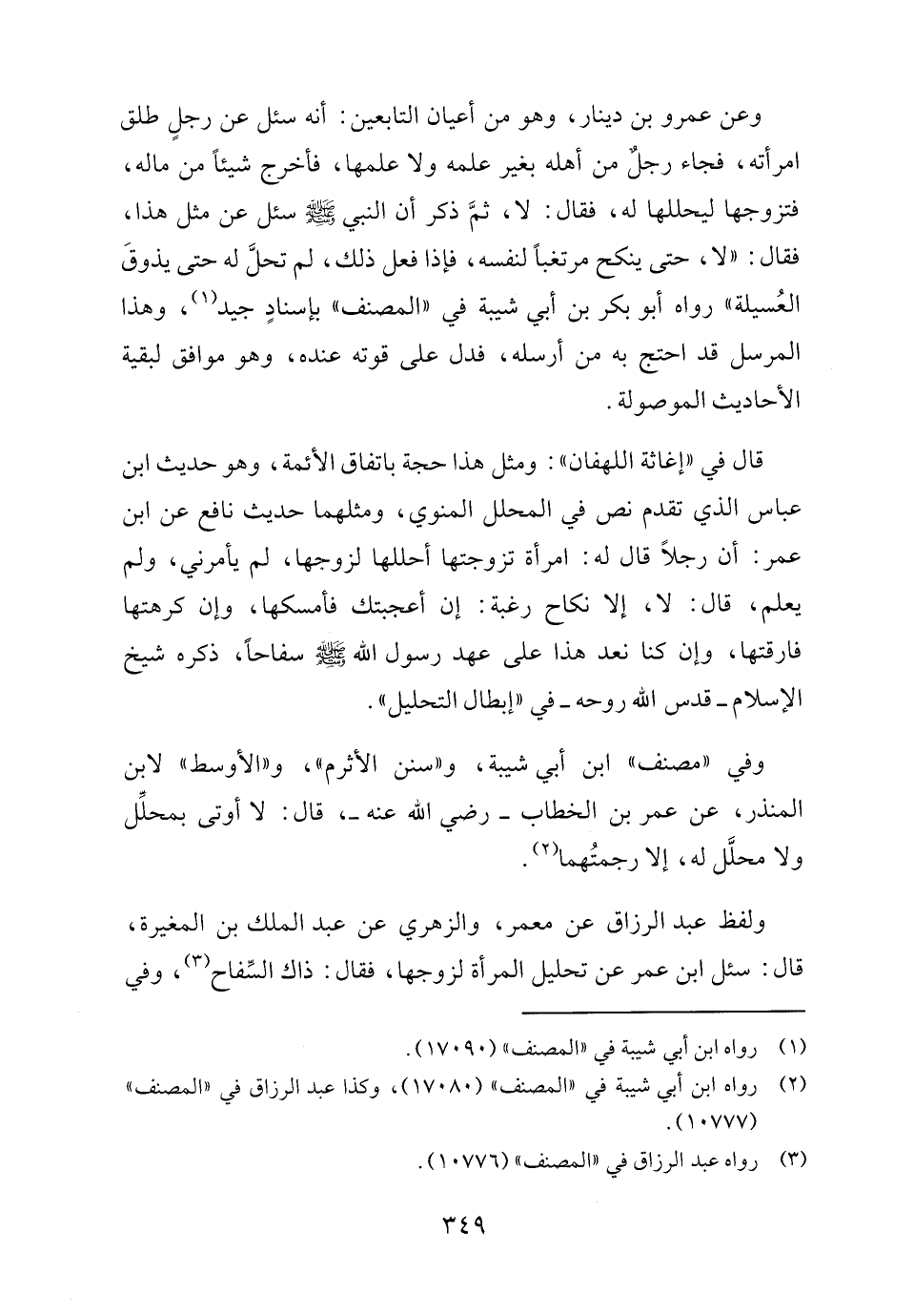 قال في "إغاثة اللهفان": ومثل هذا حجة باتفاق الأئمة، وهو حديث ابن عباس الذي تقدم نص في المحلل المنوي، ومثلهما حديث نافع عن ابن عمر: أن رجلًا قال له: امرأة تزوجتها أحللها لزوجها، لم يأمرني، ولم يعلم، قال: لا، إلا نكاح رغبة: إن أعجبتك فأمسكها، وإن كرهتها فارقتها، وإن كنا نعد هذا على عهد رسول الله - صلى الله عليه وسلم - سفاحًا، ذكره شيخ الإسلام -قدس الله روحه- في "إبطال التحليل".